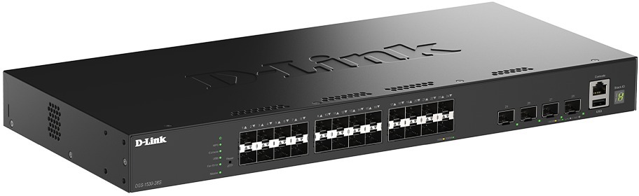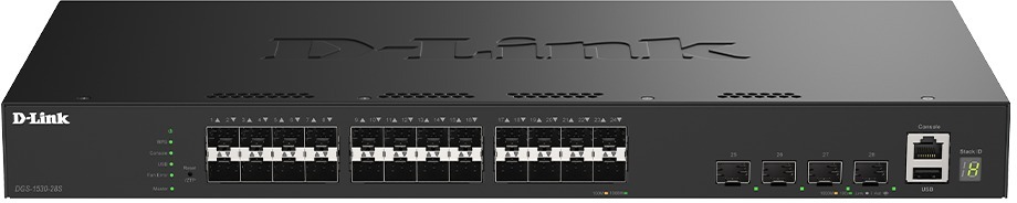 D-Link DGS-1530-28S — це 24-портовий гігабітний стековий керований комутатор із волоконними портами SFP для низхідного з’єднання та чотирма 10G SFP+ портами для висхідного з’єднання. Продукт має статус A1 v1.00 (активний) і підтримує фізичне стекування до 9 комутаторів, що забезпечує гнучке масштабування мережі. Усі гігабітні порти Ethernet мають захист від перенапруги 6 кВ, а комутатор підтримує резервне джерело живлення (RPS) і функцію Zero-Touch Provisioning (ZTP) для автоматичного налаштування.