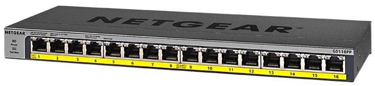 Netgear GS116PP — некерований 16 портовий PoE+ комутатор із загальним бюджетом потужності 183 Вт. Надає основні функції для роботи в бізнес-мережах і живить пристрої PoE+, такі як телефони VoIP, IP-камери тощо.