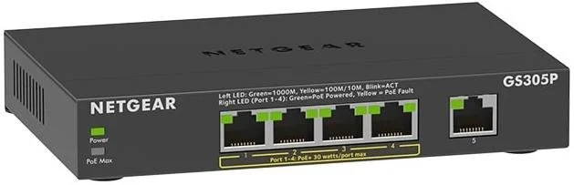 Netgear GS305P — гігабітний 5-портовий некерований комутатор NETGEAR GS305P Gigabit Ethernet SOHO з 4 портами PoE і бюджетом потужності 55 Вт для живлення бездротової точки доступу, IP-камер, IP-телефонів та інших PoE-пристроїв. GS305P надає прості в управлінні, основні мережеві функції за доступною ціною для малого та середнього бізнесу.