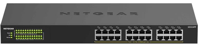Netgear GS324PP — 24-портовий високопотужний некерований комутатор Gigabit Ethernet із 24-портами PoE+. 24 порти PoE+ із бюджетом потужності 380 Вт. Це просте, надійне та доступне підключення до мережі для дому та невеликих офісів. Забезпечує живлення та дані за допомогою одного кабелю Ethernet.
