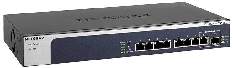 Netgear XS508M — мультигігабітний комутатор, який забезпечує підключення FastEthernet, 1-Gigabit, 2,5-Gigabit, 5-Gigabit або 10-Gigabit, а також 1 оптоволоконний порт SFP+ з підключенням 1-Gigabit або 10-Gigabit. Кожен порт автоматично визначає, яку швидкість вимагає підключений пристрій, тому забезпечує відповідну швидкість.