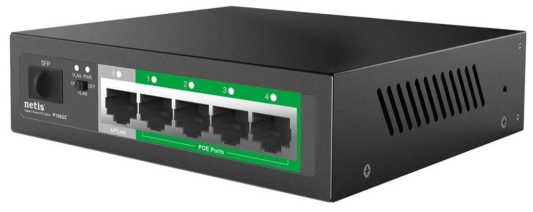 Netis P106GC пропонує чудовий вибір для розширення домашньої, магазинної чи офісної мережі. Він повністю відповідає стандартам Ethernet IEEE802.3/802.3u/802.3ab/802.3z. Забезпечує 4 гігабітні порти POE RJ45, 1 гігабітний висхідний порт RJ45 і 1 гігабітний SFP-порт. Усі порти POE RJ45 підтримують функцію живлення через Ethernet і можуть автоматично виявляти та подавати живлення на сумісні з IEEE 802.3at/af Powered Devices (PD). Завдяки штучному інтелекту P106GC автоматично відновить пристрої POE, які не відповідають, QoS, VLAN забезпечать більш плавну мережу та краще використання.