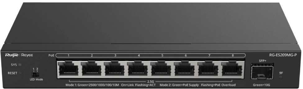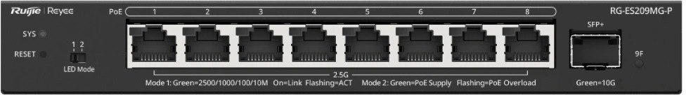 Живлення RG-ES209MG-P здійснюється через вбудований блок з бюджетом PoE у 130 Вт, сумісний зі стандартами IEEE 802.3 af/at, що дозволяє живити до восьми пристроїв одночасно з автоматичним моніторингом за допомогою PoE Watchdog. Пристрій оснащений функціями безпеки, такими як ізоляція портів і фільтрація трафіку, що захищає мережу від несанкціонованого доступу.