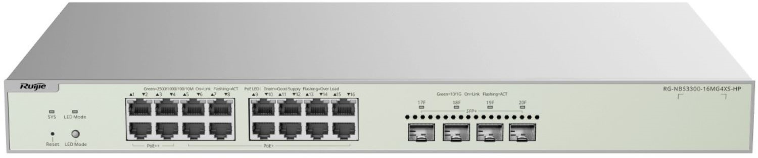 Комутатор RG-NBS3300-16MG4XS-HP від Ruijie Reyee є потужним керованим комутатором другого рівня, призначеним для забезпечення високошвидкісного мережевого з'єднання в сучасних бізнес-середовищах. Цей пристрій ідеально підходить для офісів, готелів, освітніх закладів та промислових об'єктів, де потрібна стабільна та масштабована мережа. З 16 портами мультигігабітної швидкості до 2,5 Гбіт/с він оптимізує роботу точок доступу Wi-Fi 6/7, дозволяючи розкрити весь потенціал бездротових технологій. Додатково, комутатор оснащений чотирма портами PoE++ та дванадцятьма портами PoE+, що відповідають стандартам 802.3bt/at/af, з загальним бюджетом живлення 370 Вт, а також чотирма 10-гігабітними SFP+ портами для висхідного з'єднання. Така конфігурація робить його універсальним рішенням для розгортання мереж з високим навантаженням.