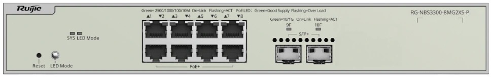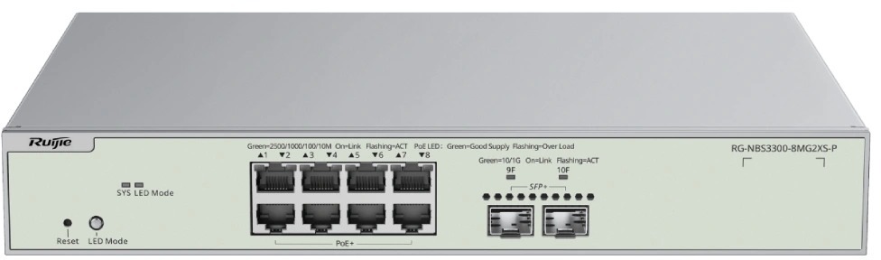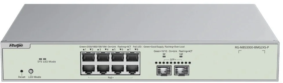 RG-NBS3300-8MG2XS-P — це сучасний комутатор рівня 2 з керуванням, розроблений компанією Ruijie Reyee для забезпечення високошвидкісного мережевого з'єднання в різних середовищах. Цей пристрій оснащений вісьмома портами RJ45, що підтримують швидкості до 2,5 Гбіт/с, що ідеально підходить для підключення точок доступу Wi-Fi 6/7, а також двома портами SFP+ для uplink-з'єднань на швидкості 10 Гбіт/с. З бюджетом PoE+ у 240 Вт комутатор дозволяє живити мережеве обладнання безпосередньо через Ethernet-кабелі, спрощуючи розгортання систем у офісах, готелях, освітніх закладах чи на заводах. Завдяки enterprise-grade якості та інтеграції з хмарними сервісами, RG-NBS3300-8MG2XS-P гарантує стабільність і ефективність мережі, розкриваючи повний потенціал сучасних бездротових технологій.