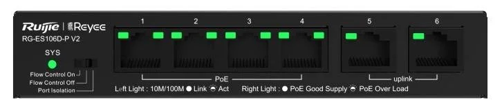 Ruijie RG-ES106D-P V2 — некерований комутатор, який має 6 портів LAN, 4 з яких підтримують POE-живлення. Виготовлений у металевому корпусі, є економічно вигідним рішенням для використання у корпоративному середовищі для малого та середнього бізнесу. Простий в налаштування, адже підтримує функцію Plug&Play.