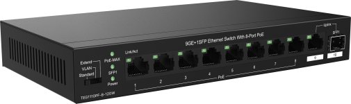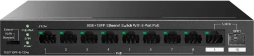 Комутатор сумісний з IEEE 802.3af/at, що дозволяє одночасно передавати дані та живити до 8 HD PoE-камер, Gigabit Wi-Fi точок доступу (AP), IP-телефонів чи інших пристроїв. Максимальна потужність на один порт — 30 Вт, а загальна потужність PoE — 120 Вт, що робить його ідеальним для систем відеоспостереження або бездротових мереж з високим навантаженням.