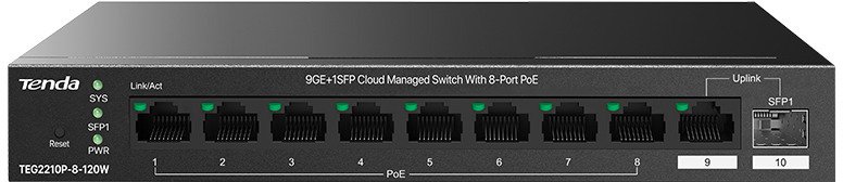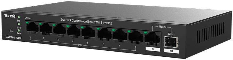 Tenda TEG2210P-8-120W — це гігабітний керований PoE-комутатор, розроблений для бізнес-мереж, де потрібна надійність, централізоване управління та живлення пристроїв через мережевий кабель.