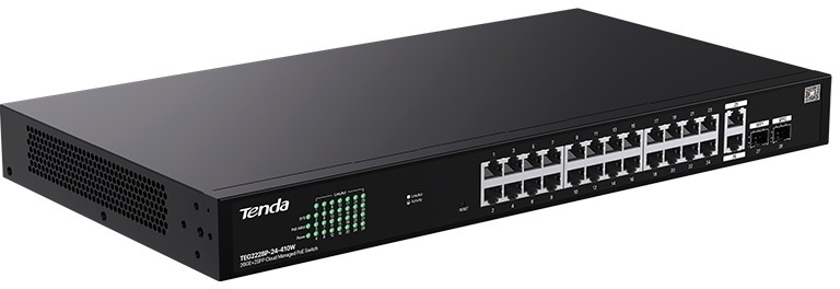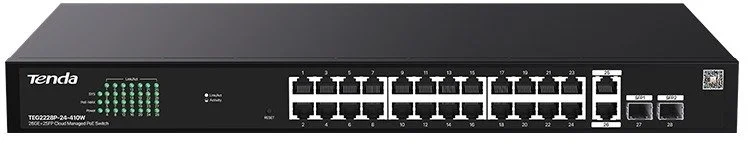 TEG2228P-24-410W від Tenda — це надійний 28-портовий гігабітний комутатор з підтримкою PoE+, спеціально розроблений для побудови сучасних мереж відеоспостереження, Wi-Fi-покриття та інших систем, що потребують живлення по Ethernet. Він оснащений 24 портами Gigabit Ethernet з підтримкою IEEE 802.3af/at, які забезпечують загальний бюджет потужності PoE до 410 Вт. Це дозволяє одночасно живити велику кількість IP-камер високої роздільної здатності, Wi-Fi точок доступу, IP-телефонів чи інших PoE-пристроїв без необхідності додаткових джерел живлення.