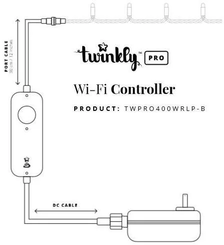 Контроллер WiFi Twinkly Pro для невеликих декорацій при підключенні світлодіодних Twinkly Pro гірлянд через WiFi. При підключенні до електрошини TWPRO400SPLITTER-2 можна створити дві окремі лінііі, керуючи до 2 по 250 = 500 RGB або AWW світлодіодами. Створюючи групи до 5,000 RGB або AWW світлодіодних ламп, або до 250 світлодіодів RGB + W в одній лінії, або до 2,500 світлодіодних ламп RGB + W в групі. Не об'єднується в одну групу з використанням Twinkly Pro Ethernet-контролера.