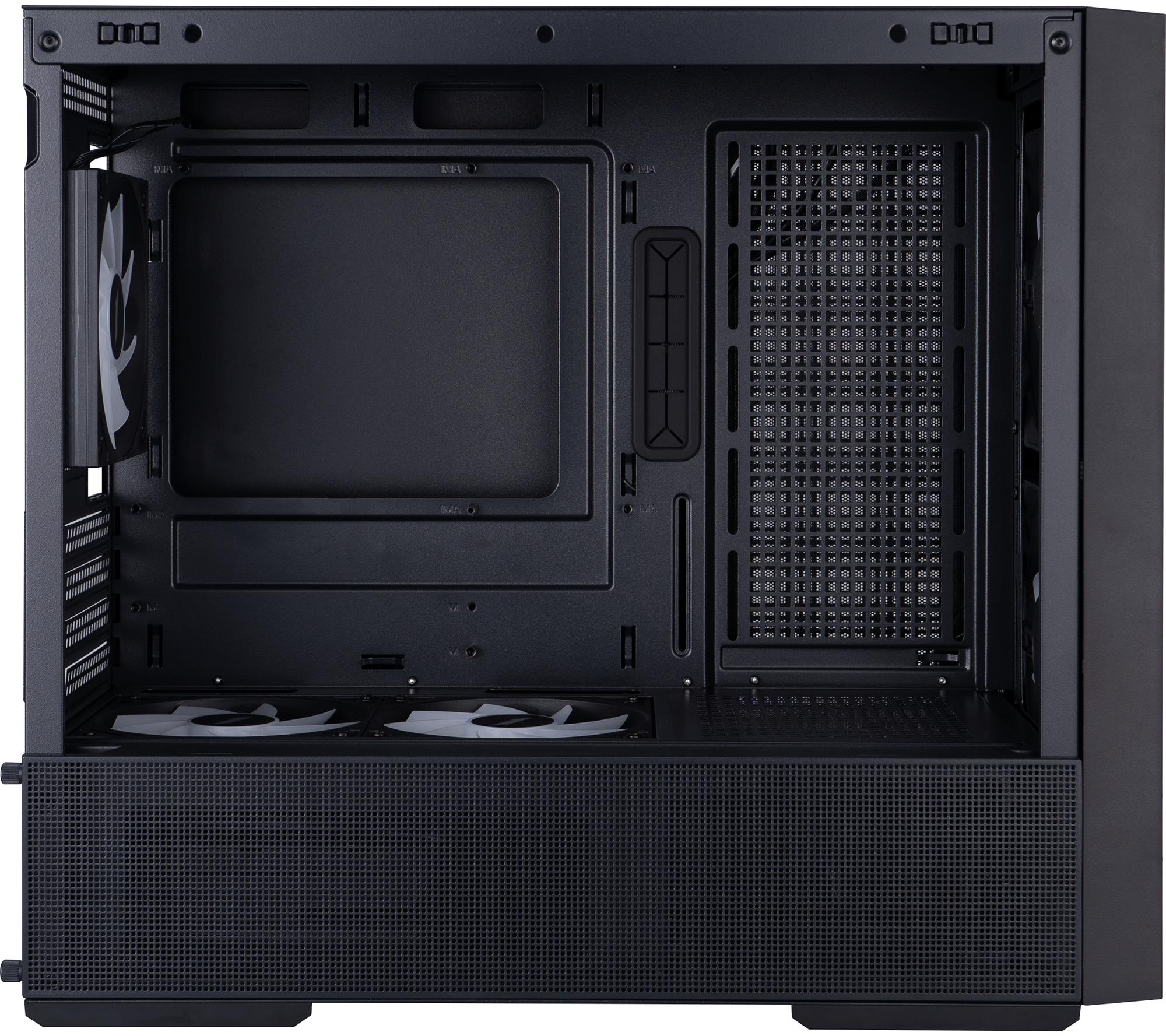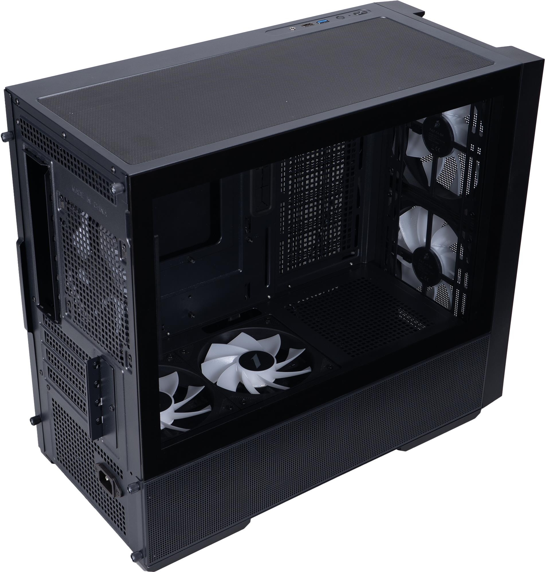 Бічна панель із загартованого скла відкриває повний огляд на компоненти всередині, а вбудоване ARGB-підсвічування перетворює систему на справжній акцент будь-якого робочого місця чи ігрової зони. На верхній панелі розташовані порти для зручного підключення периферії: USB 2.0, USB 3.0 та аудіороз'єм.