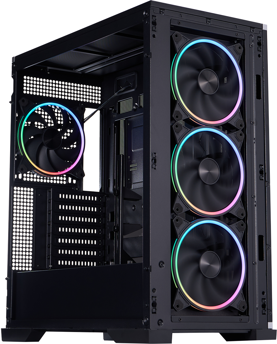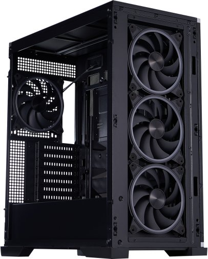 Корпус пропонує величезний внутрішній простір: відеокарти до 390 мм, процесорні кулери до 180 мм висотою, підтримка дев’яти 120-мм або восьми 140-мм вентиляторів, а також радіаторів СВО до 420 мм спереду та 360 мм зверху. Додатково передбачено міцний вбудований тримач для відеокарти, який надійно фіксує навіть найважчі моделі, запобігаючи провисанню та зберігаючи ідеальний вигляд усієї збірки.