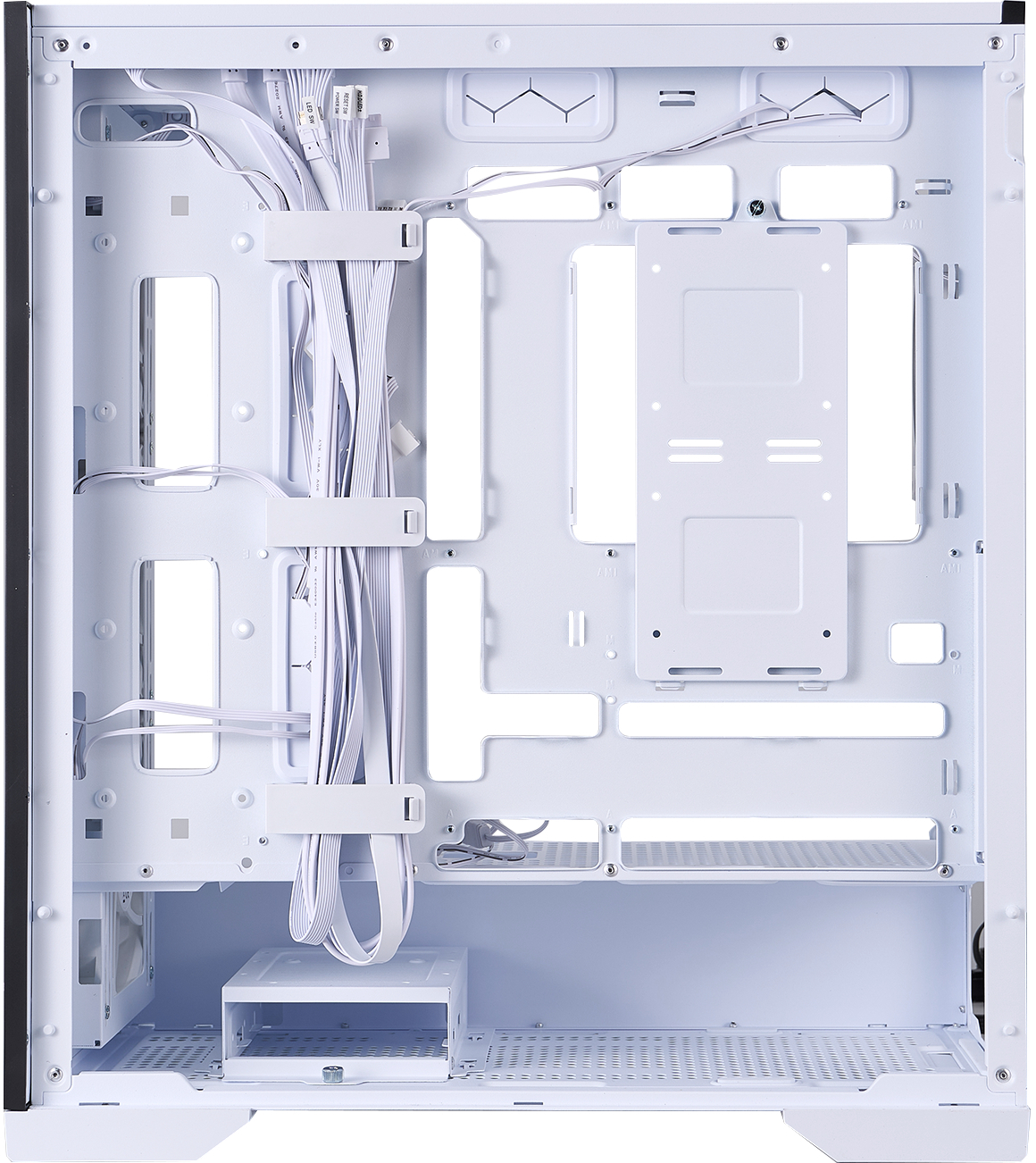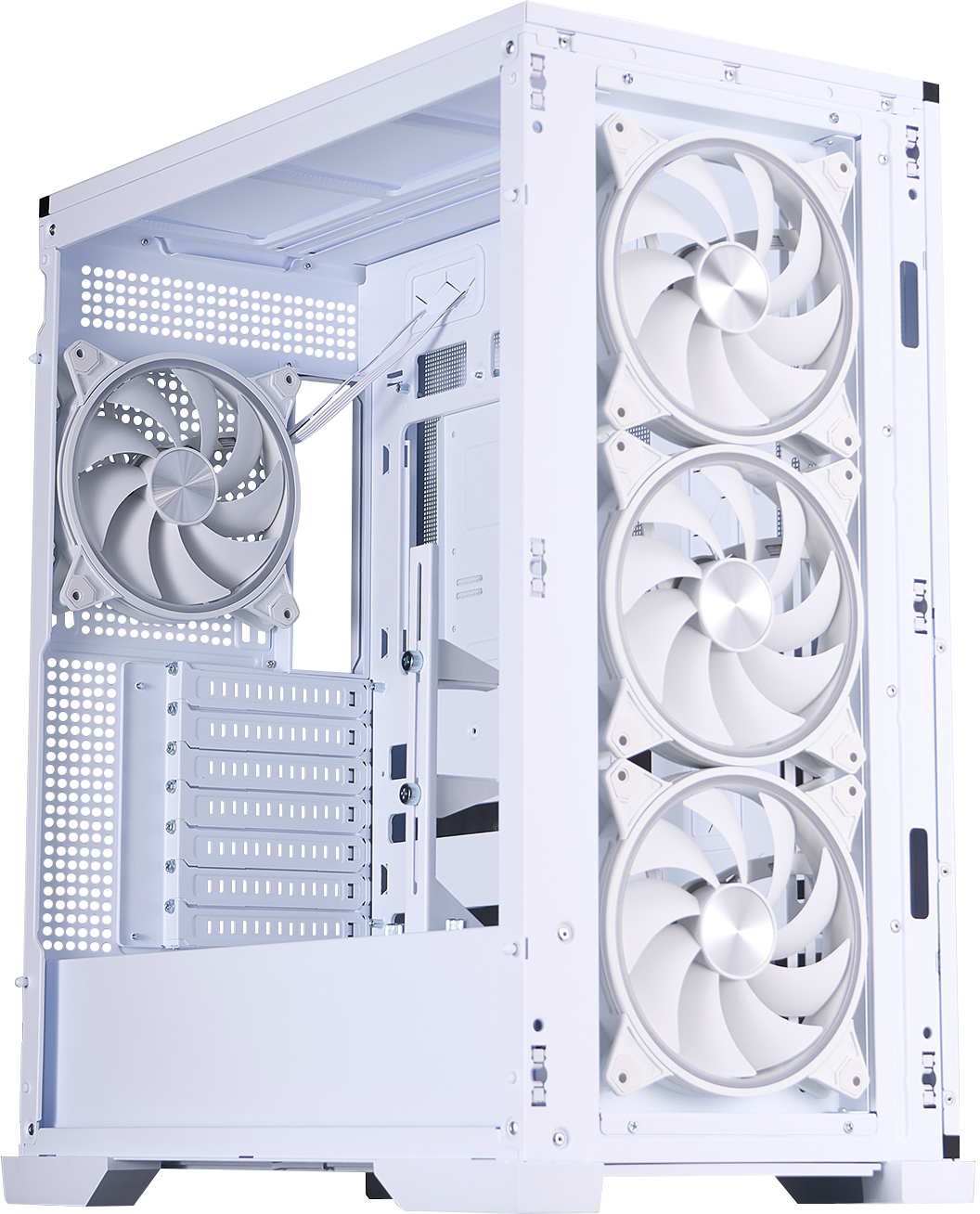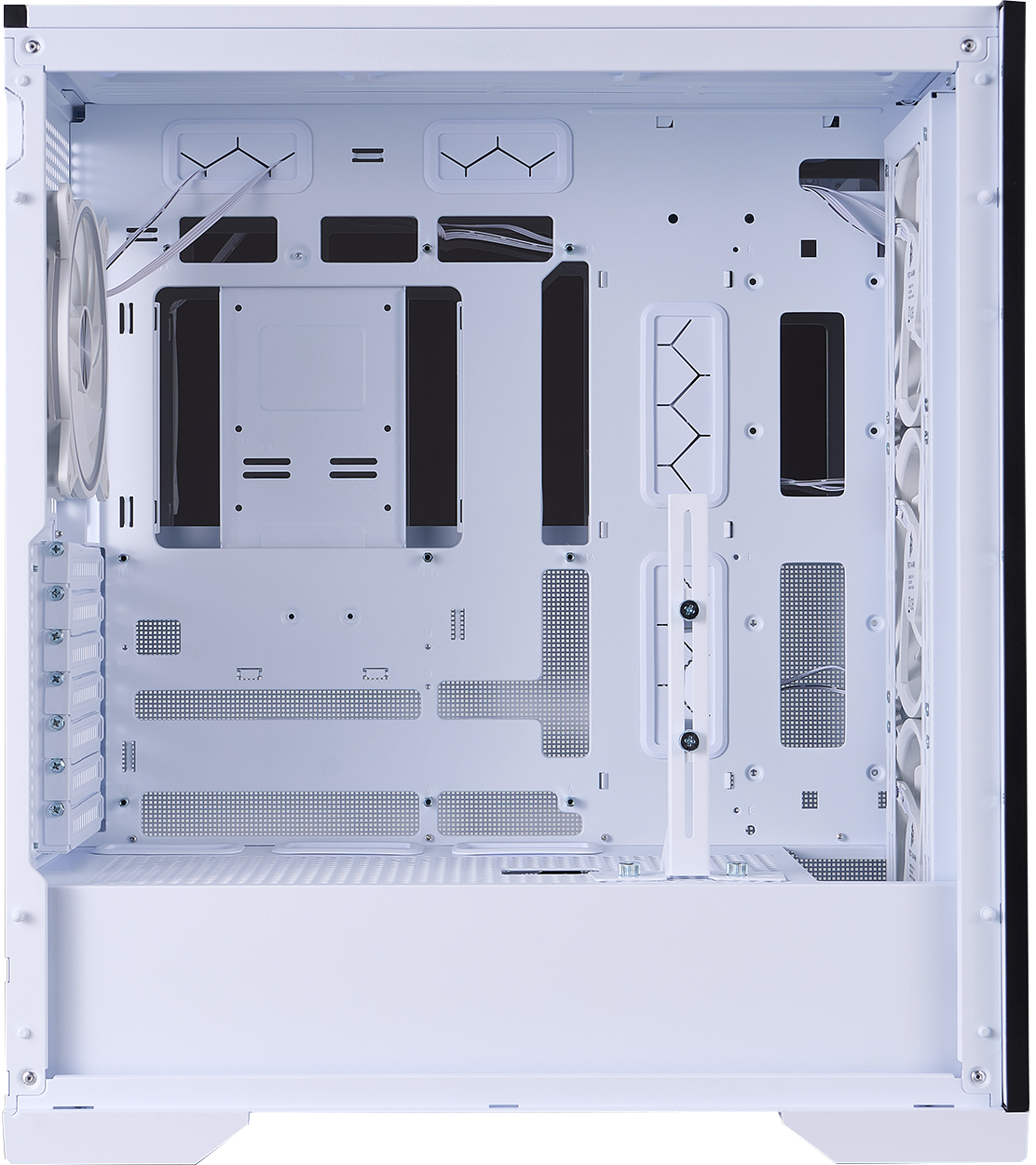 Корпус пропонує величезний внутрішній простір: відеокарти до 390 мм, процесорні кулери до 180 мм висотою, підтримка дев’яти 120-мм або восьми 140-мм вентиляторів, а також радіаторів СВО до 420 мм спереду та 360 мм зверху. Додатково передбачено міцний вбудований тримач для відеокарти, який надійно фіксує навіть найважчі моделі, запобігаючи провисанню та зберігаючи ідеальний вигляд усієї збірки.