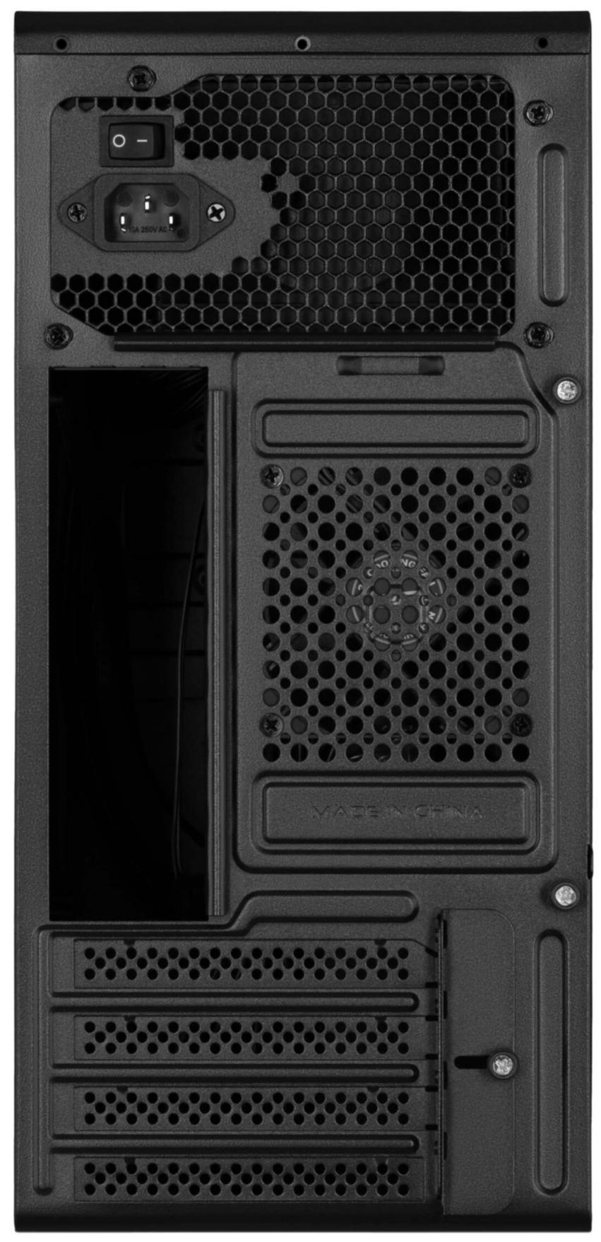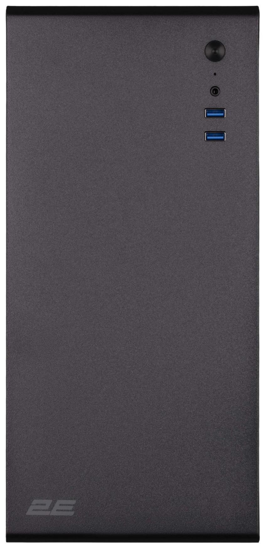 На передній панелі розташовані сучасні роз’єми: два порти USB 3.0, HD Audio + мікрофон, кнопки живлення й перезавантаження, а також індикатори активності. Корпус розрахований на стандартний блок живлення ATX із верхнім розташуванням.