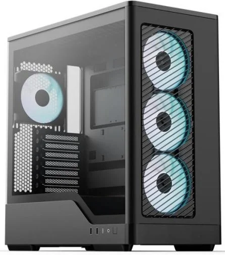 Вентиляція вражає: спереду встановлено три ARGB-вентилятори, які створюють потужний повітряний потік, а ззаду — вентилятор для швидкого відведення тепла. Підтримка рідинного охолодження дозволяє встановити радіатори спереду і зверху, що ідеально для топових систем із серйозним розгоном.