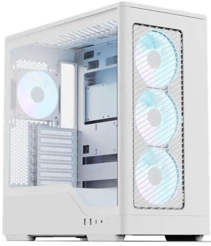 Вентиляція вражає: спереду встановлено три ARGB-вентилятори, які створюють потужний повітряний потік, а ззаду — вентилятор для швидкого відведення тепла. Підтримка рідинного охолодження дозволяє встановити радіатори спереду і зверху, що ідеально для топових систем із серйозним розгоном.