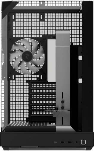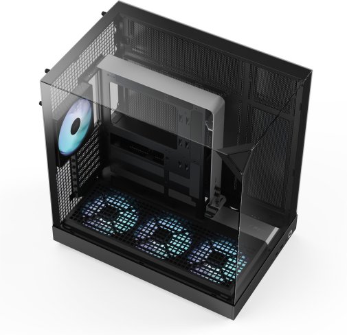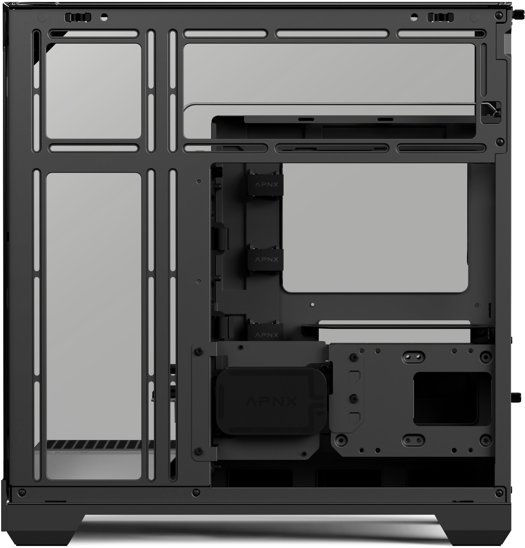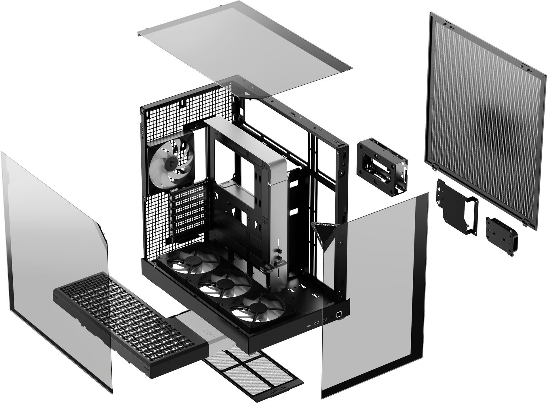 Усередині встановлений 10-портовий хаб APNX ARGB PWM Fan Hub 1, який забезпечує зручне керування вентиляторами та синхронізацію RGB-підсвічування. Разом із чотирма попередньо встановленими вентиляторами (три знизу та один ззаду) він створює збалансований потік повітря та високу продуктивність охолодження.