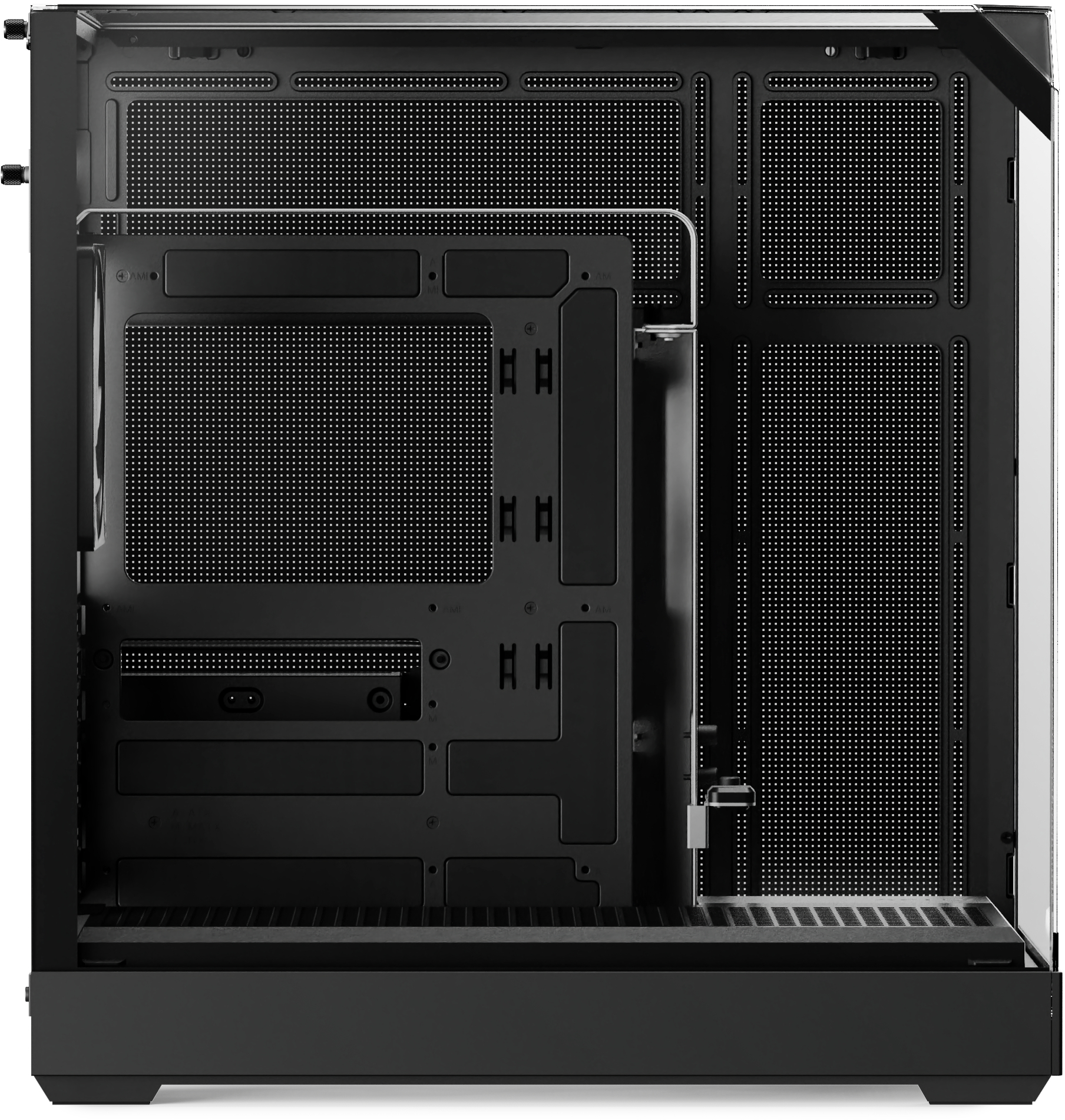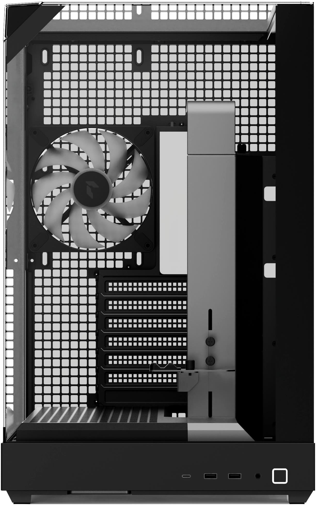 Панорамні панелі із загартованого скла з трьох боків — спереду, збоку та зверху — забезпечують огляд внутрішньої частини корпусу майже на 86,5%. Це дає можливість повністю оцінити дизайн системи, підсвічування та компонування.