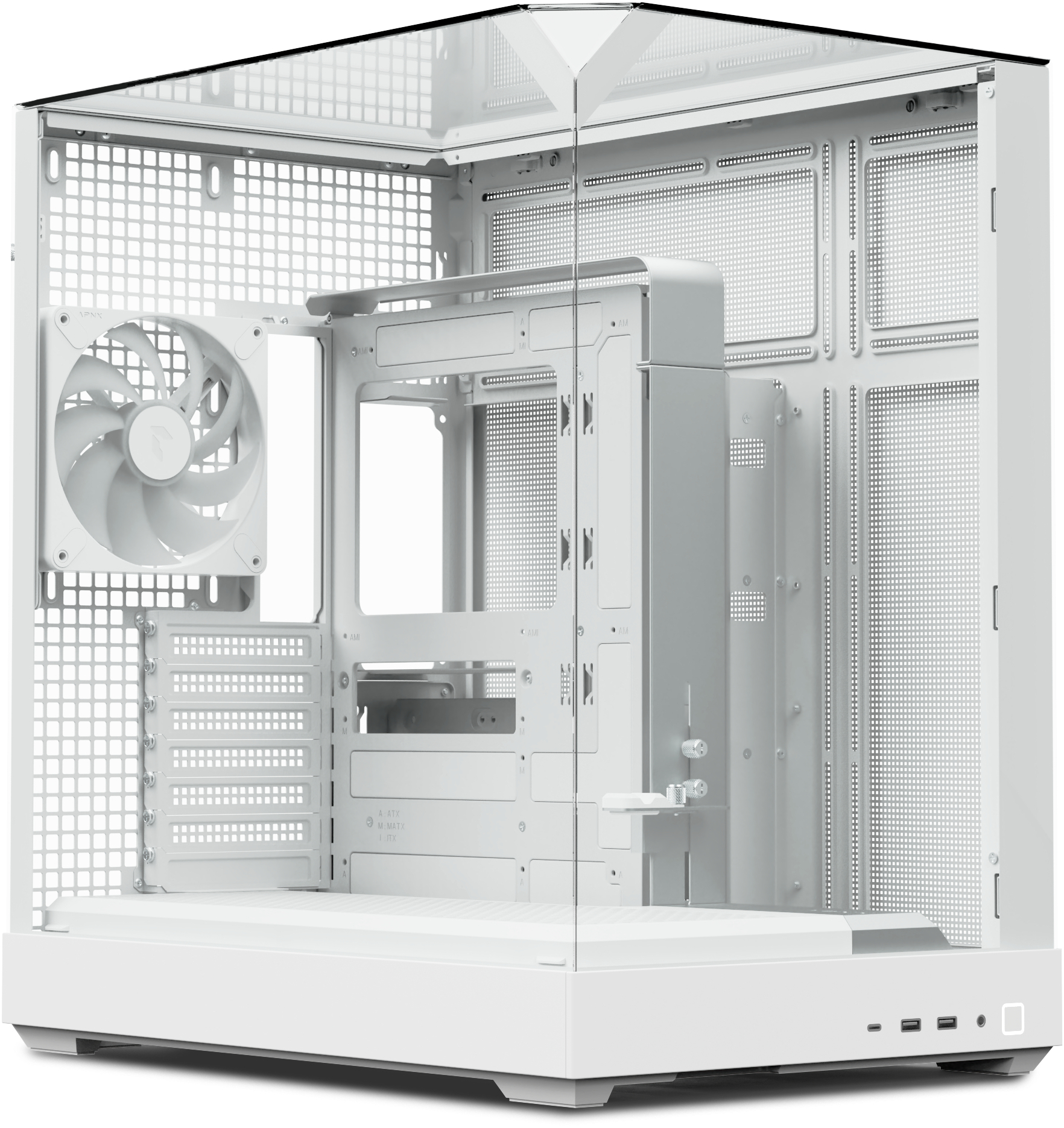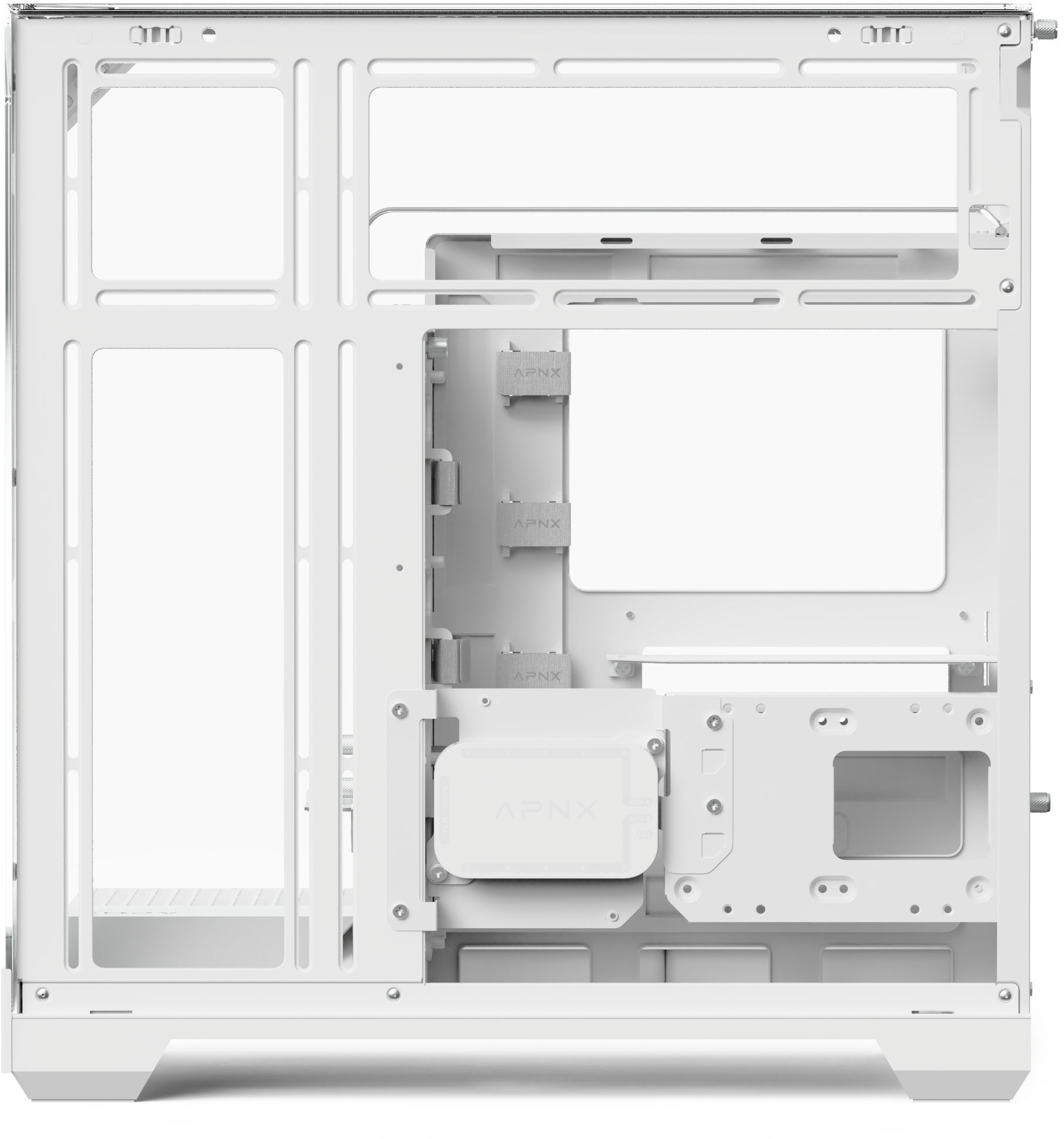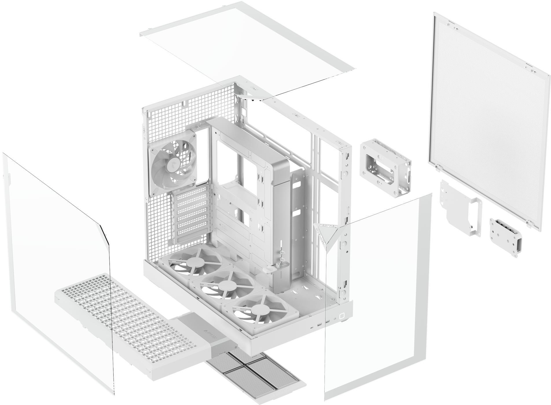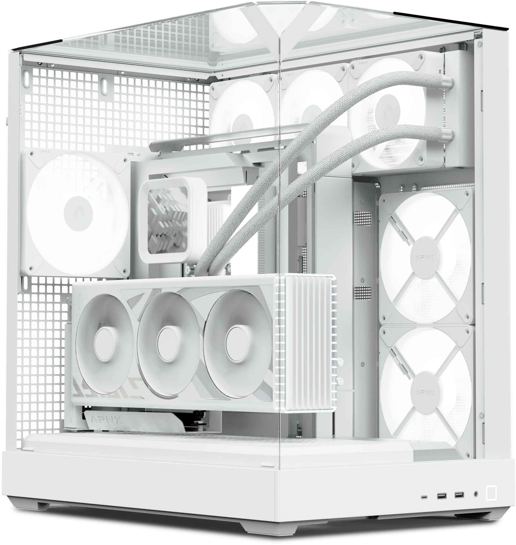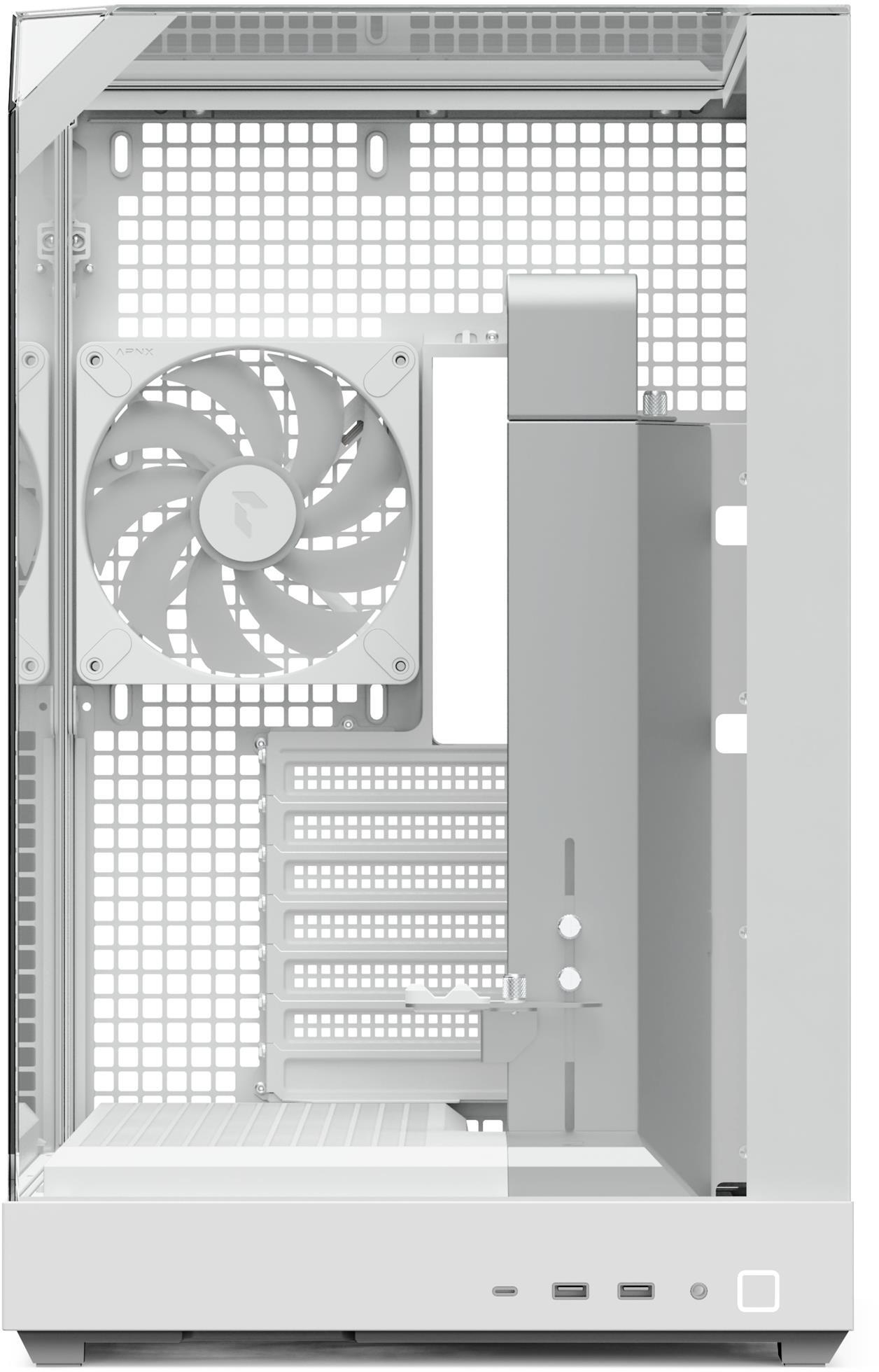 Усередині встановлений 10-портовий хаб APNX ARGB PWM Fan Hub 1, який забезпечує зручне керування вентиляторами та синхронізацію RGB-підсвічування. Разом із чотирма попередньо встановленими вентиляторами (три знизу та один ззаду) він створює збалансований потік повітря та високу продуктивність охолодження.