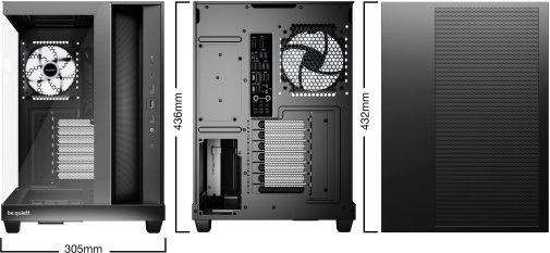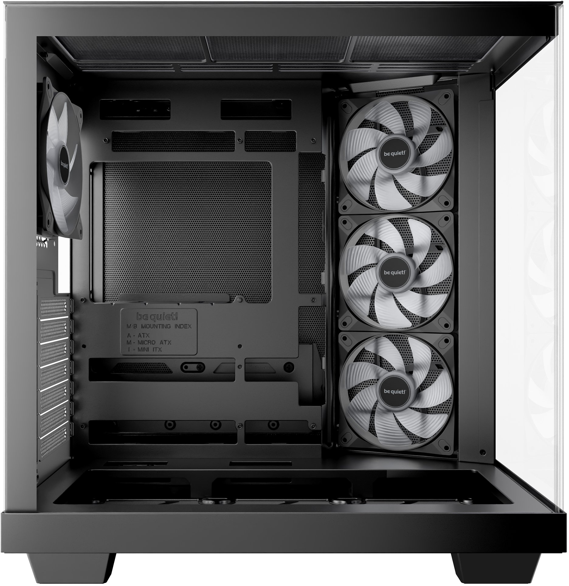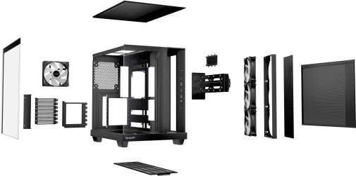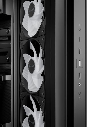 У базовій комплектації встановлено чотири вентилятори Light Wings LX 120 мм PWM: три на бічній панелі зі зворотними лопатями, що забезпечують прямий приплив повітря до відеокарти, та один на задній панелі для витяжки. Кожен вентилятор має 16 світлодіодів у маточині крильчатки для виразного ARGB-підсвічування. Кнопка керування ARGB з попередньо заданими ефектами та кольорами інтегрована в панель вводу-виводу, а всі вентилятори підключені до 6-канального хабу ARGB і PWM, що залишає 4 вільні роз'єми для додаткових пристроїв. Нахилена рамка на бічній панелі виїжджає вгору для зручного монтажу. Знімні пилові фільтри на бічній і нижній панелях спрощують обслуговування.