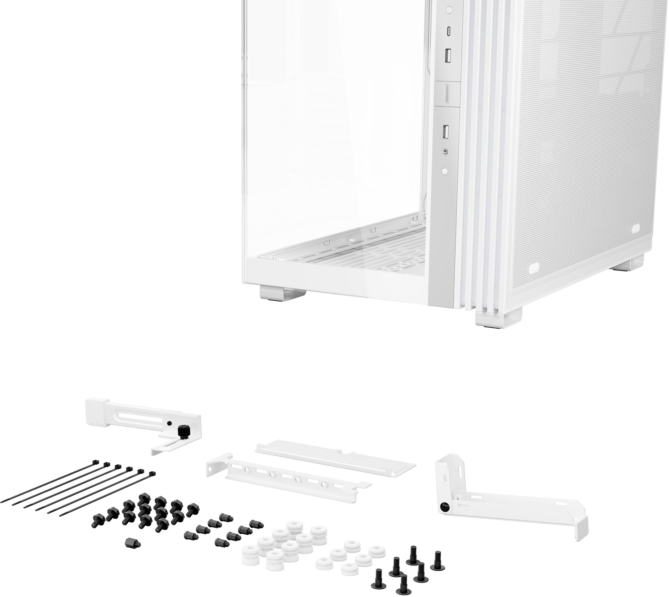 Для зручності управління периферією та підсвічуванням у комплекті йдуть два хаби — ARGB і PWM — з дванадцятьма роз'ємами в сумі, розміщених у верхній і нижній частинах корпусу. Гнучкий тримач відеокарти ненав'язливо запобігає її провисанню і коректно працює у будь-якій орієнтації корпусу. На передній панелі розміщені два порти USB-A 3.2 Gen 1, один порт USB-C 3.2 Gen 2, комбінований аудіороз'єм 3,5 мм, кнопки живлення та перезавантаження. Доступно сім слотів розширення.