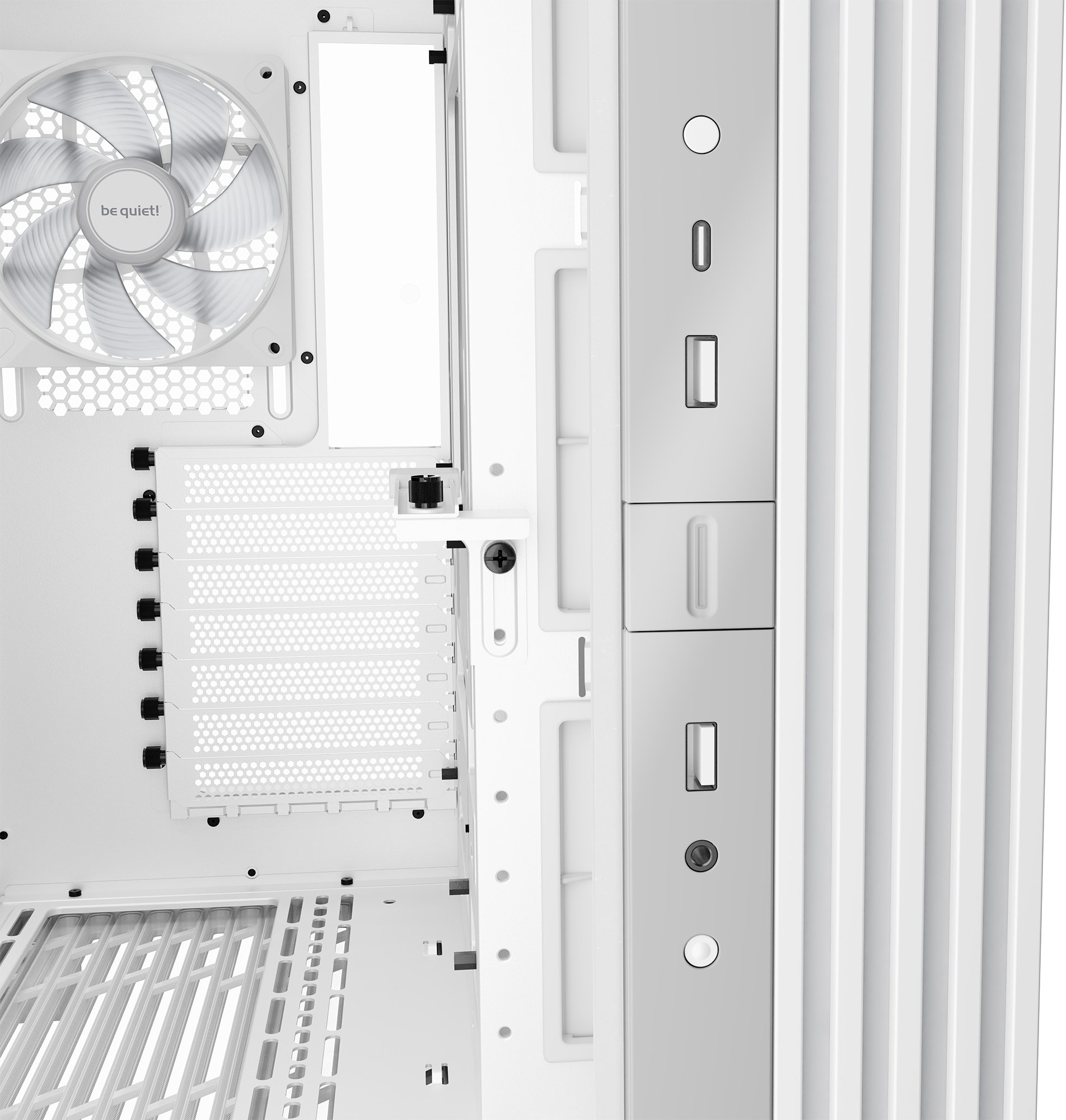 Внутрішній простір корпусу вражає продуманістю та місткістю. Підтримуються відеокарти довжиною до 400 мм, процесорні кулери заввишки до 170 мм, а також материнські плати форматів ATX, mATX та Mini-ITX. Двокамерна конструкція відокремлює блок живлення, накопичувачі й кабелі від основної зони з материнською платою, що суттєво покращує циркуляцію повітря. Одночасно можна встановити два радіатори 360 мм — у верхній і нижній частинах корпусу, а також ще один радіатор до 240 мм збоку, що в сумі дає три радіатори. Попередньо встановлених вентиляторів немає, однак корпус розрахований на монтаж до 10 вентиляторів загалом — повна свобода у формуванні власної системи охолодження.