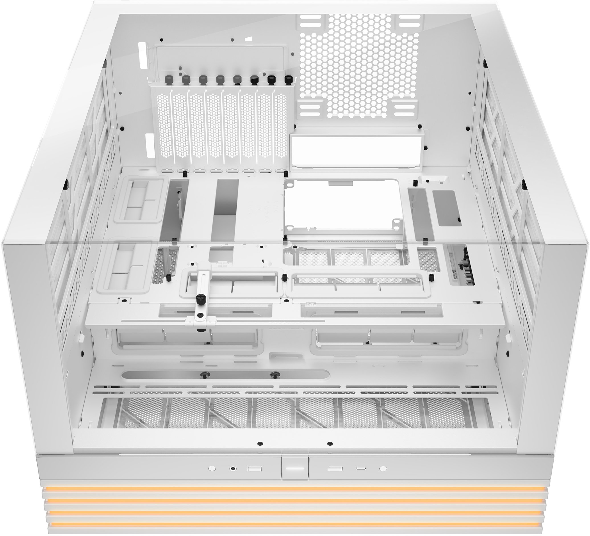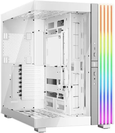 Перше, що впадає в очі — панорамний огляд «нутрощів» комп'ютера завдяки повністю прозорим фронтальній та боковій скляним панелям. Але справжньою родзинкою є вбудована світлодіодна стрічка ARGB завдовжки 3 метри з 172 діодами, яку видно з усіх кутів. Підсвічування синхронізується з материнською платою через стандартні 5V ARGB-роз'єми, а два вбудованих ARGB-PWM-концентратори загалом надають 12 портів підключення для вентиляторів та LED-стрічок — все це дозволяє створити неповторну підсвітку системи без зайвих адаптерів і розгалужувачів.