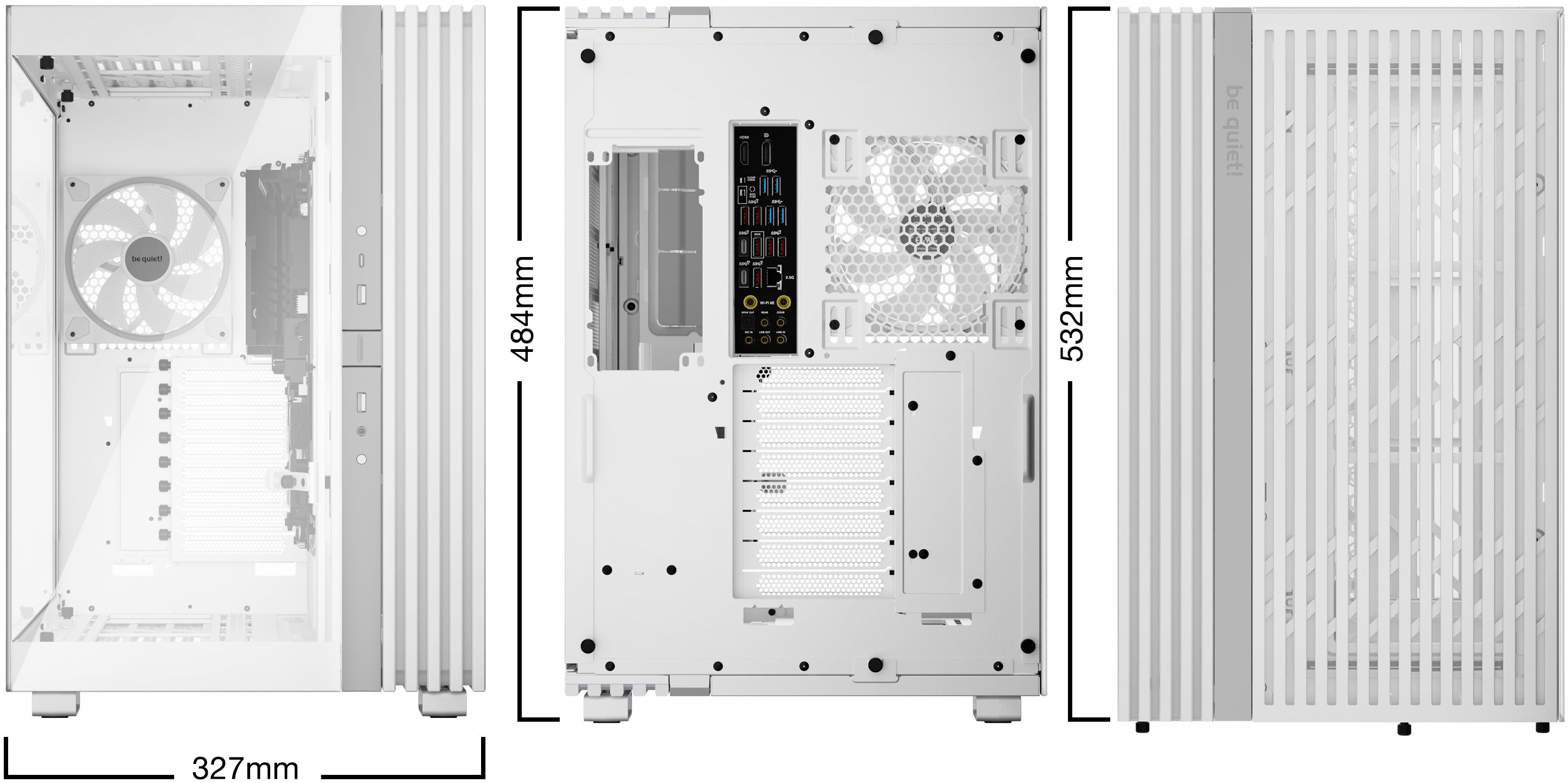 На відміну від бюджетніших аналогів, Light Base 900 FX постачається з чотирма попередньо встановленими вентиляторами Light Wings 140mm PWM. Три з них оснащені реверсними лопатями та встановлені на боковому кріпленні як бокове всмоктування, а четвертий — традиційного виконання — розташований ззаду як витяжка.Сім аеродинамічно оптимізованих лопатей кожного вентилятора мінімізують турбулентність і шум навіть при підвищеному навантаженні. За необхідності можна встановити ще шість вентиляторів, довівши їхню загальну кількість до десяти.