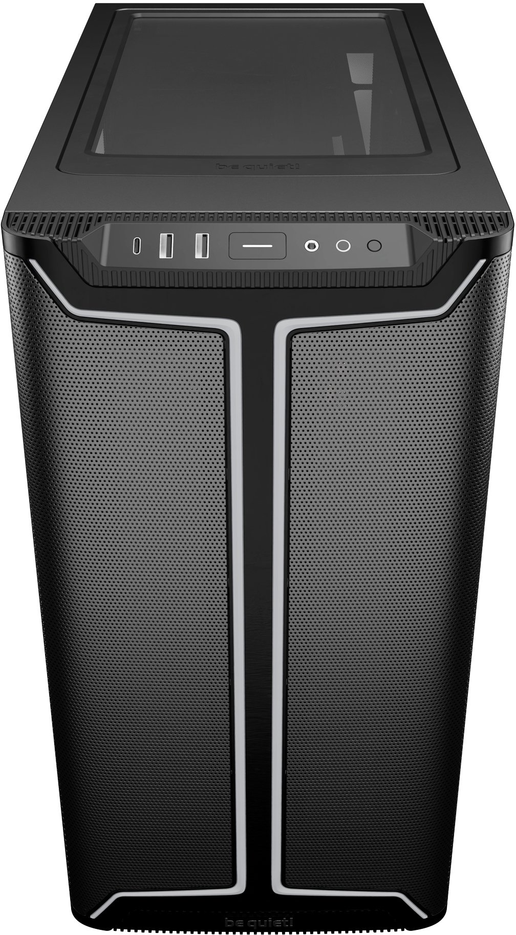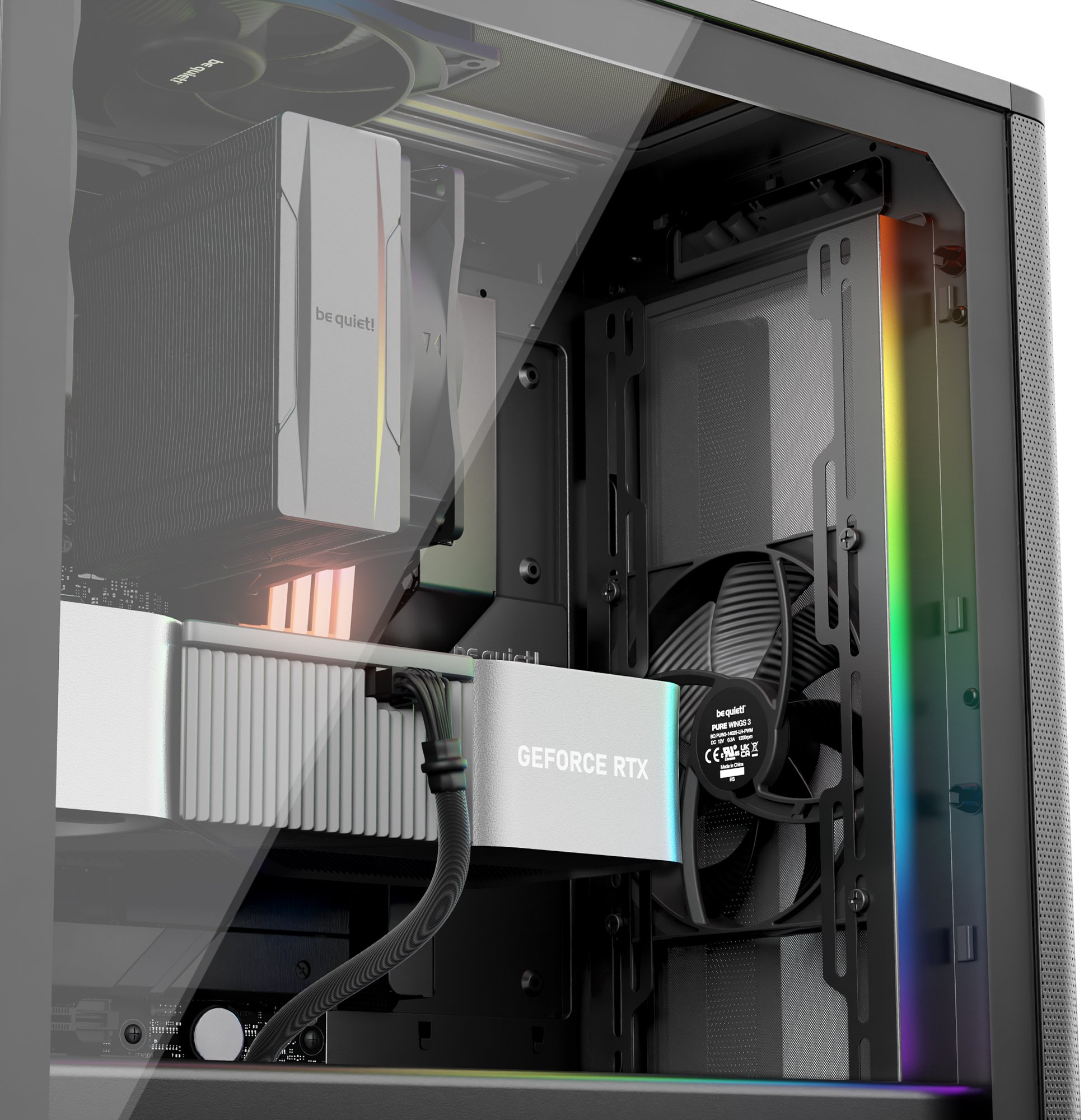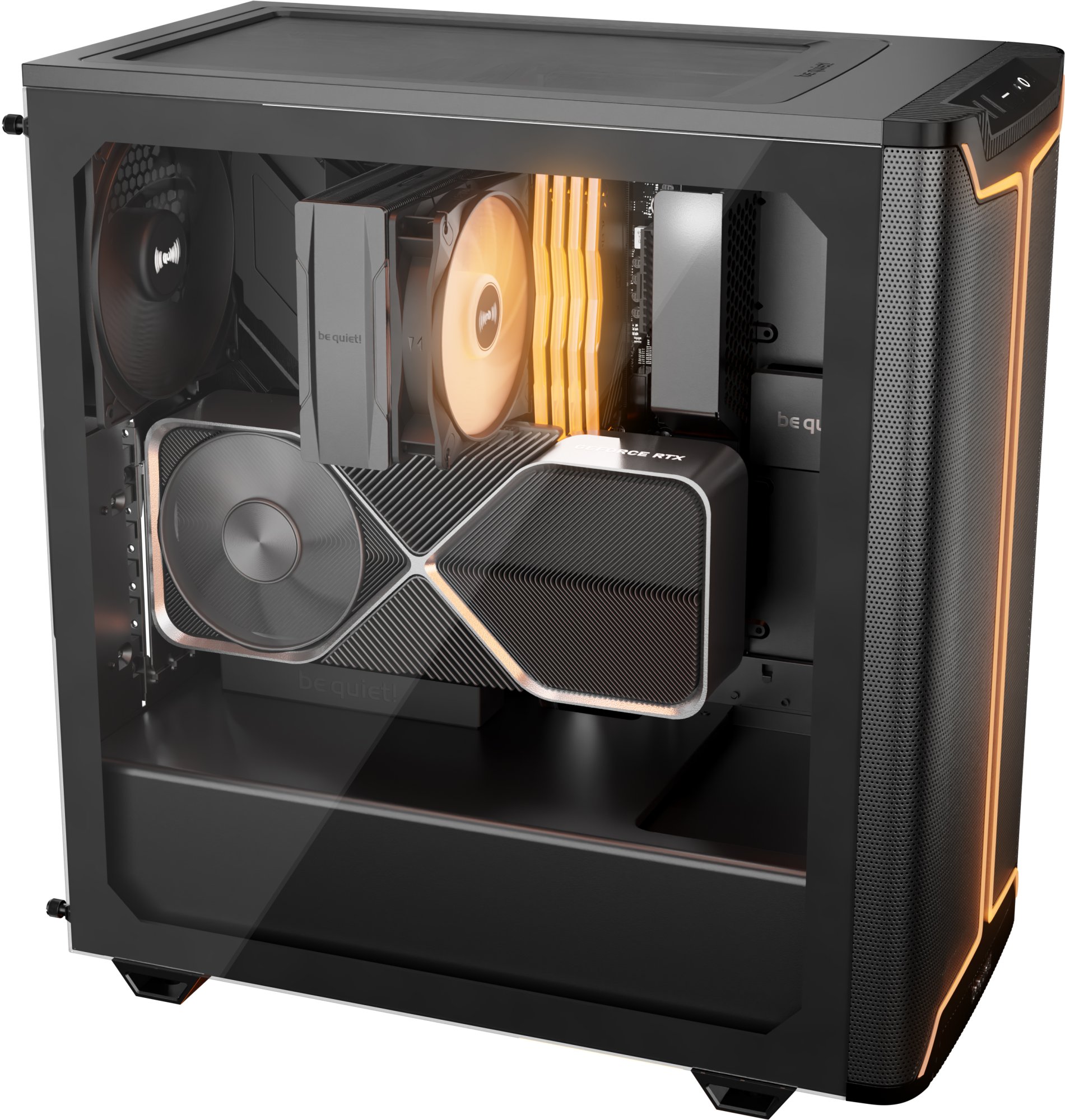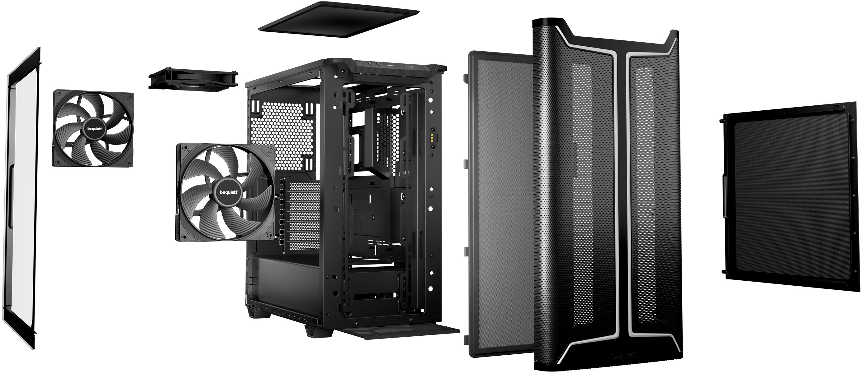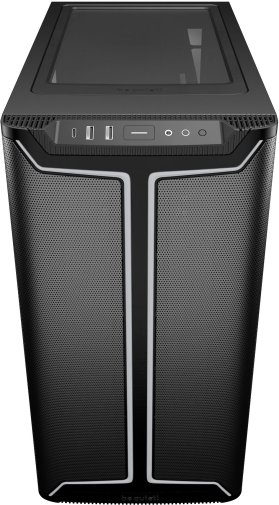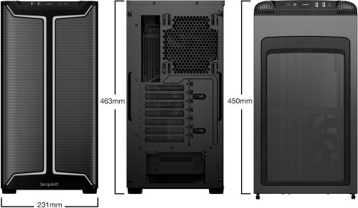 Корпус підтримує радіатори СРО: до 360 мм спереду (120/140/240/280/360 мм), до 240 мм зверху (120/240 мм) та до 140 мм ззаду (120/140 мм) — що дозволяє встановити одночасно два повноцінних радіатори для потужних збірок із рідинним охолодженням. Максимальна довжина відеокарти — 368 мм при будь-якій конфігурації. Слоти PCIe можна повертати на 90° для вертикального встановлення відеокарти з оглядом крізь скляне вікно — разом з опціональним be quiet! Riser Cable підтримується до 5 слотів PCIe у вертикальній позиції без ризику провисання. Для накопичувачів передбачено 2 відсіки для 3.5" HDD та 5 відсіків для 2.5" SSD. На передній панелі ввід-вивід: 1× USB 3.2 Gen 2 Type-C, 2× USB 3.2 Gen 1 Type-A та комбінований аудіороз'єм для навушників і мікрофона.
