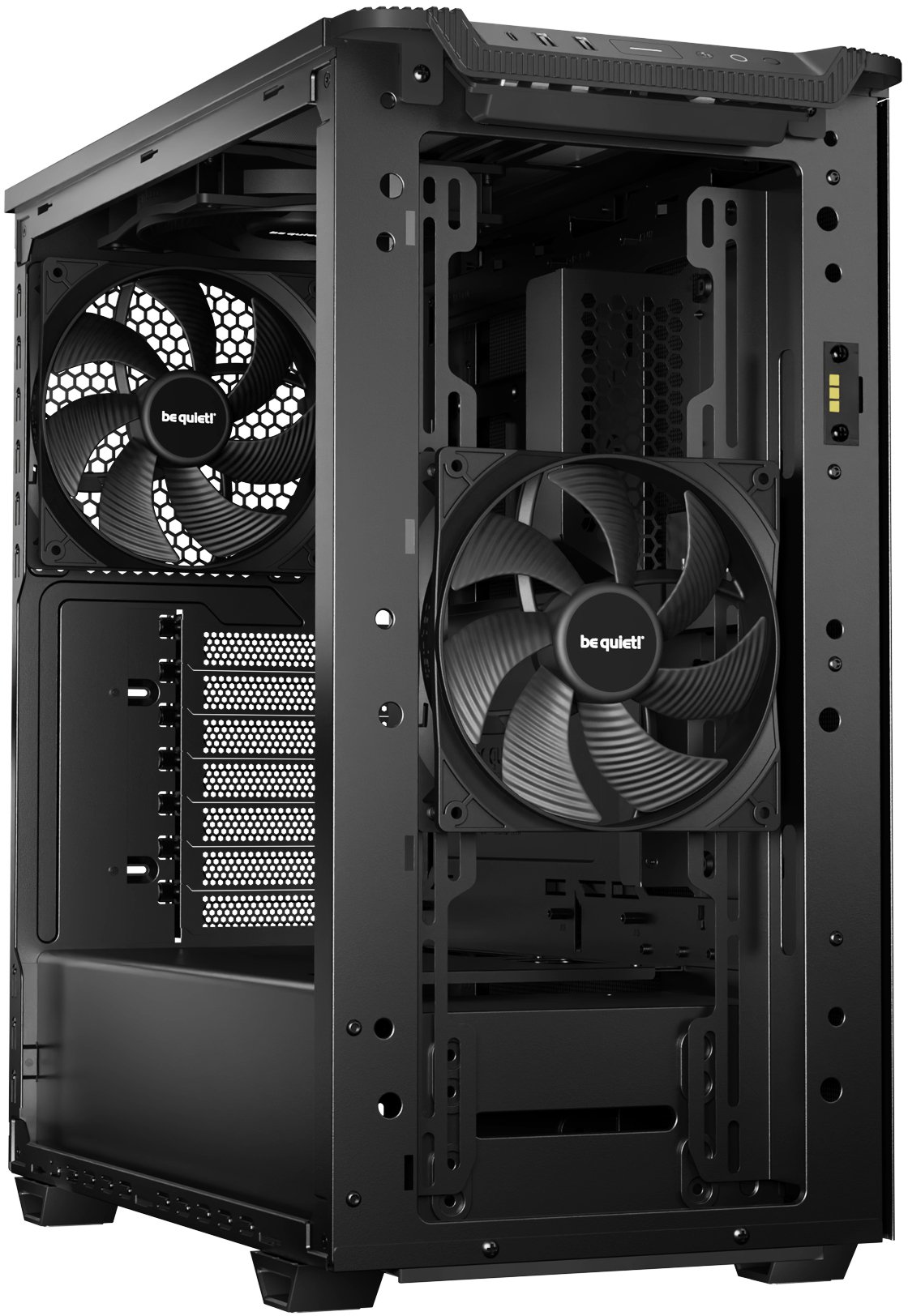 На відміну від версій Airflow і Airflow Window у цій моделі у комплекті встановлені 3 вентилятори Pure Wings 3 140mm PWM: один спереду, один зверху та один ззаду — що забезпечує більш потужну та збалансовану циркуляцію повітря з коробки. Кожен вентилятор має 7 лопатей спеціальної аеродинамічної форми для зниження турбулентності, максимальну швидкість 1200 об/хв, повітряний потік 57.4 CFM / 97.5 м³/год, тиск повітря 0.96 мм H₂O та рівень шуму лише 21.9 дБ(А) — тихо навіть на повній швидкості. Ресурс вентиляторів — 80 000 годин, підключення — 4-pin PWM. Загальна максимальна кількість вентиляторів — 6: 2×140 мм або 2×120 мм зверху, 2×140 мм або 3×120 мм спереду, 1×140 мм або 1×120 мм ззаду.