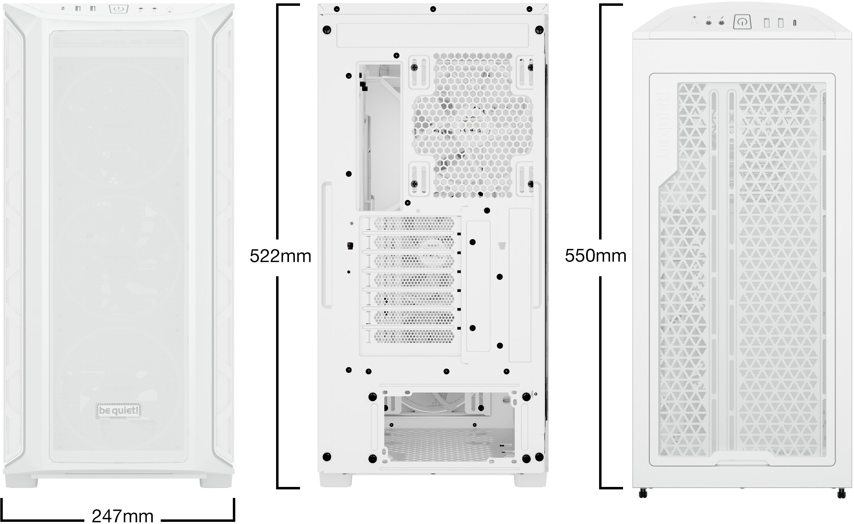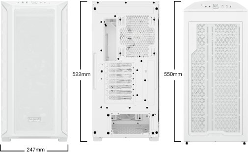 be quiet! Shadow Base 800 FX — це повнорозмірний корпус формату Full-Tower із відкритою сітчастою конструкцією фронтальної та верхньої панелей, розроблений для геймерів і ентузіастів, яким важливі і максимальна продуктивність охолодження, і ефектний зовнішній вигляд. Бокова панель із тонованого загартованого скла з чорними крайками відкриває повний огляд внутрішнього простору, а колір корпусу робить систему по-справжньому виразною.