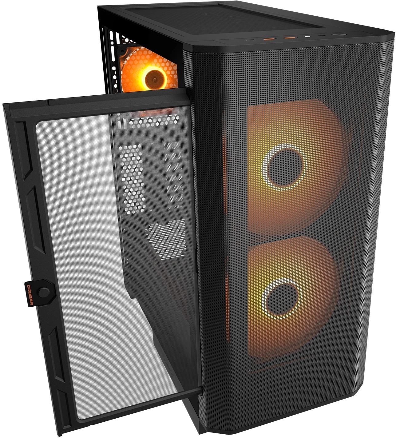 Cougar Airface FLO RGB — це сучасний корпус, створений з акцентом на максимальний повітряний потік та ефективне охолодження компонентів. Передня панель виконана у класичному сітчастому дизайні, що забезпечує безперешкодний забір повітря. Корпус комплектується двома великими 180-мм ARGB PWM-вентиляторами спереду та одним 120-мм ARGB PWM-вентилятором ззаду, які працюють у діапазоні обертів з підтримкою PWM-регулювання. Завдяки такій конфігурації та продуманій вентиляції Airface FLO RGB чудово справляється з відведенням тепла навіть у потужних ігрових збірках.