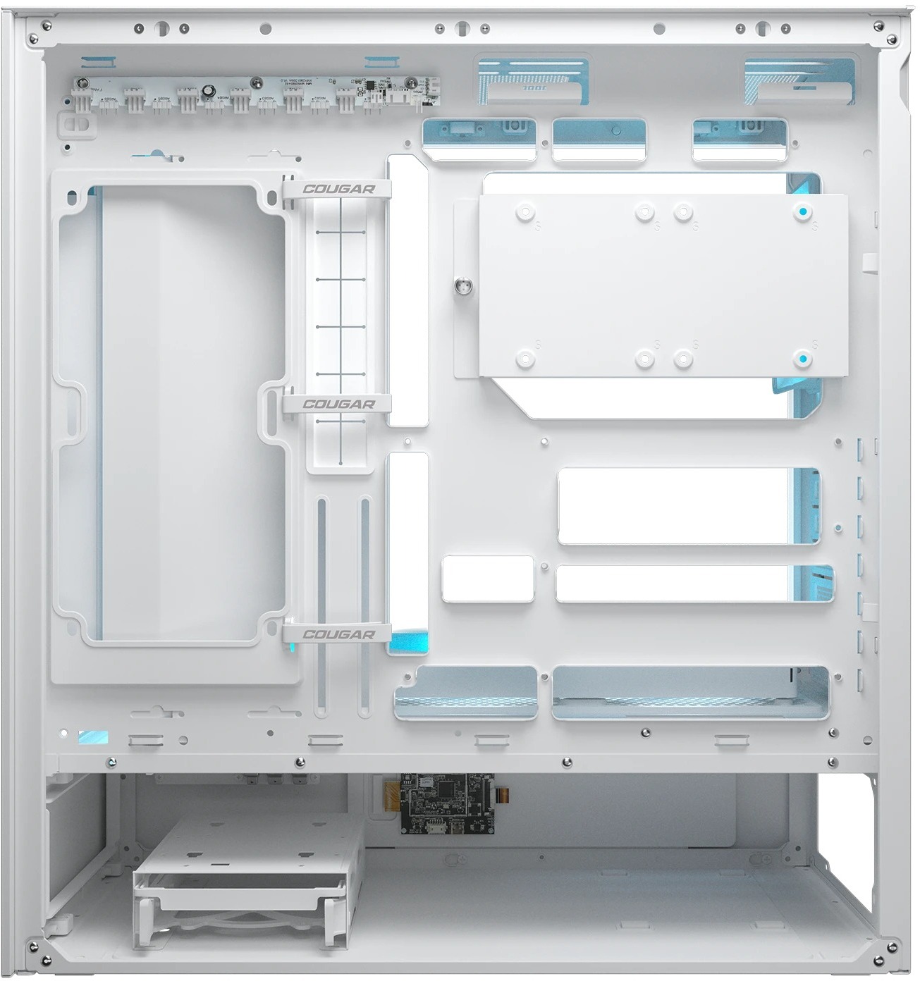 Корпус Cougar CFV235 Mesh Vision представляє собою інноваційне рішення в сегменті корпусів Mid-Tower, що поєднує футуристичний дизайн із винятковою ефективністю охолодження. Його ключовою особливістю є унікальна структура Central Floating Ventilation (CFV) — центральна «плаваюча» вентиляція, яка розділяє відсік блока живлення та основну камеру, створюючи вільний простір для максимального доступу повітря з 270° кутом. Завдяки цьому корпус зберігає компактні габарити (235 × 493 × 460 мм), але забезпечує значно кращий повітряний потік, ніж традиційні моделі, дозволяючи компонентам працювати в оптимальних температурних умовах навіть під високим навантаженням.