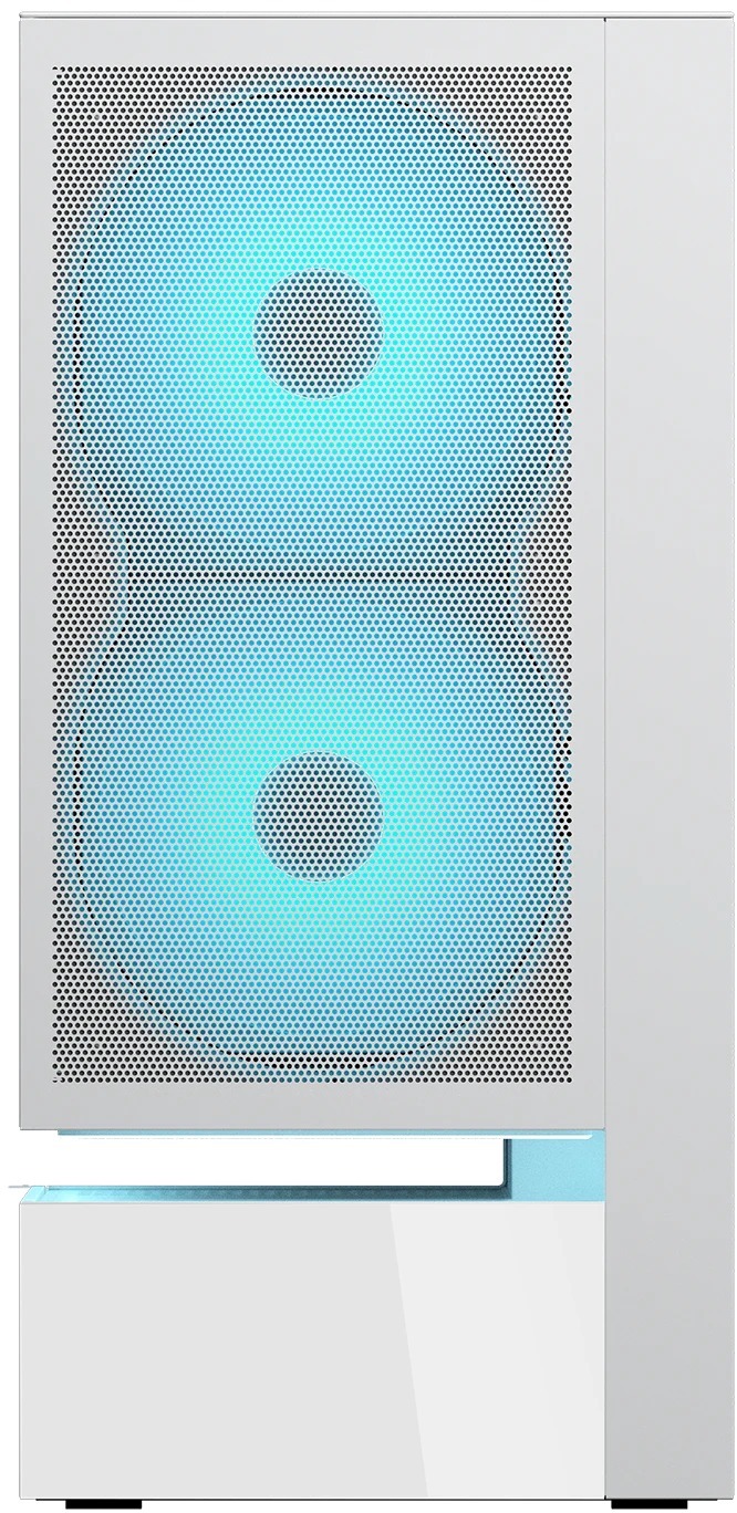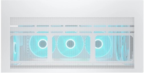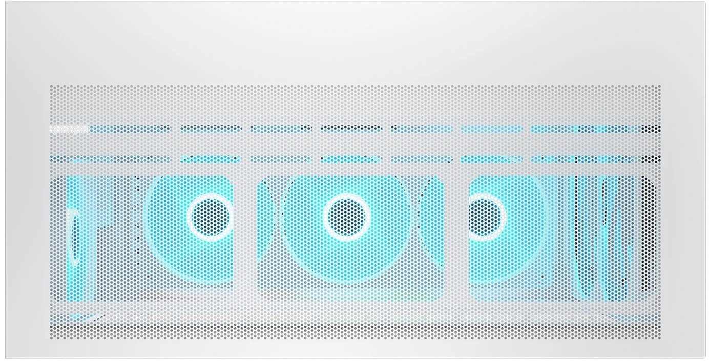 Передня панель виконана у форматі 3-в-1 модуля: вона поєднує металеву сітку (mesh) для відмінного пропускання повітря, два попередньо встановлені 160-мм ARGB PWM-вентилятори та знімний магнітний пиловий фільтр. Додатково корпус оснащений ще кількома вентиляторами (включаючи реверсивний 360-мм знизу та 120-мм ззаду), а загальна підтримка сягає 9 вентиляторів і радіаторів водяного охолодження до 360 мм зверху, що робить його ідеальним для потужних геймерських або робочих конфігурацій.