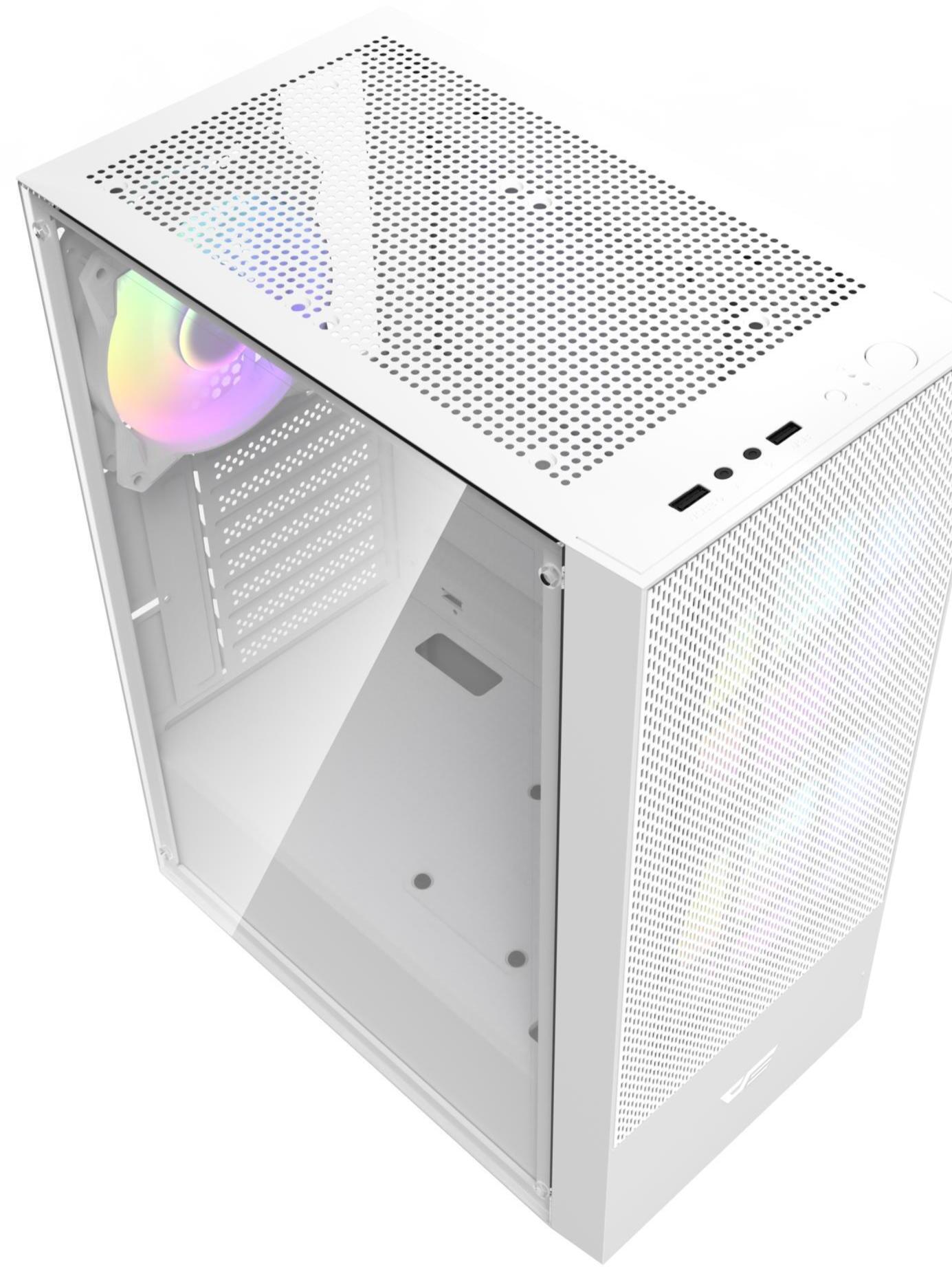 Конструкція корпусу виконана з міцної сталі SPCC, а бічна панель виготовлена зі загартованого скла, що забезпечує ефектний огляд внутрішніх компонентів і додає сучасного стилю. Компактний дизайн не заважає ефективному охолодженню: корпус підтримує встановлення вентиляторів на верхній панелі (2 × 120 мм), фронтальній (2 × 120 мм) та задній (1 × 120 мм).