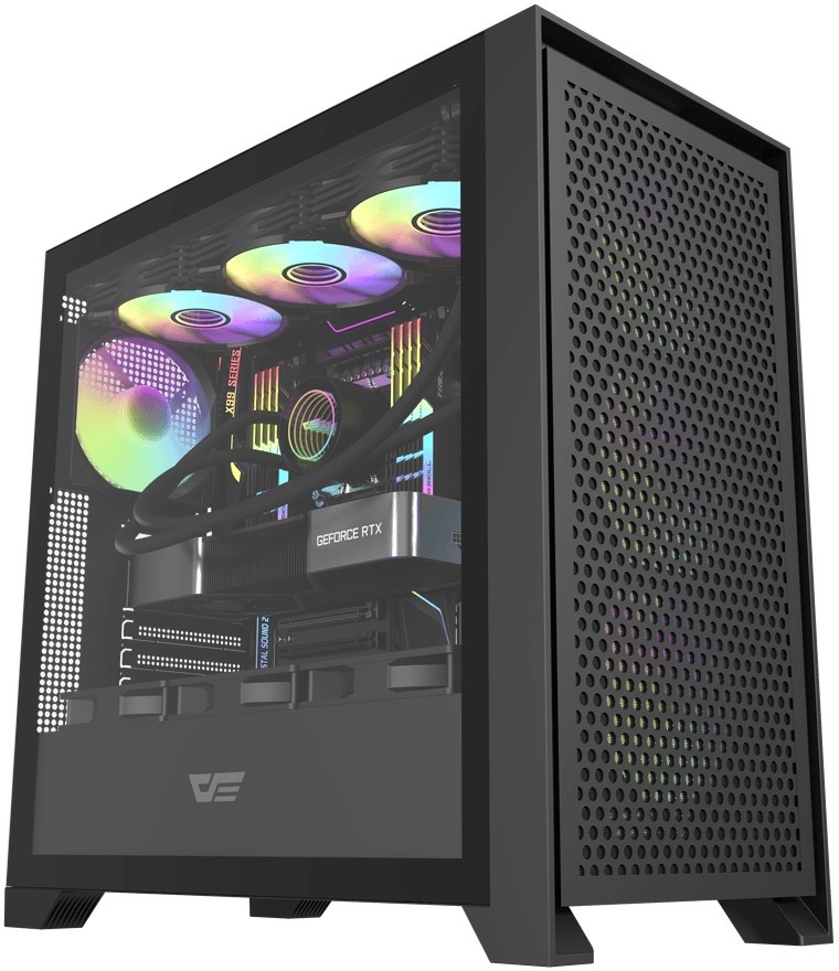 Корпус darkFlash DRX90 Mesh є сучасним ATX-рішенням для складання потужних комп'ютерних систем. Його головна особливість — магнітна передня панель, яка дозволяє легко замінювати скляну вставку на сітчасту (mesh) для покращення вентиляції. Бічна панель виконана з загартованого скла, що дає змогу демонструвати внутрішні компоненти, а загальний дизайн корпусу поєднує естетику та практичність.