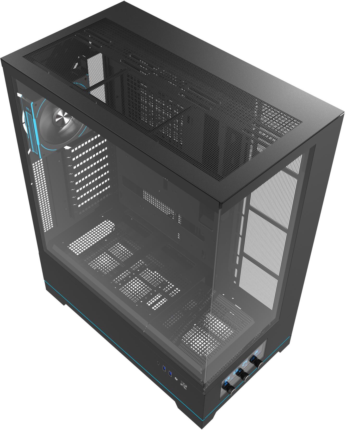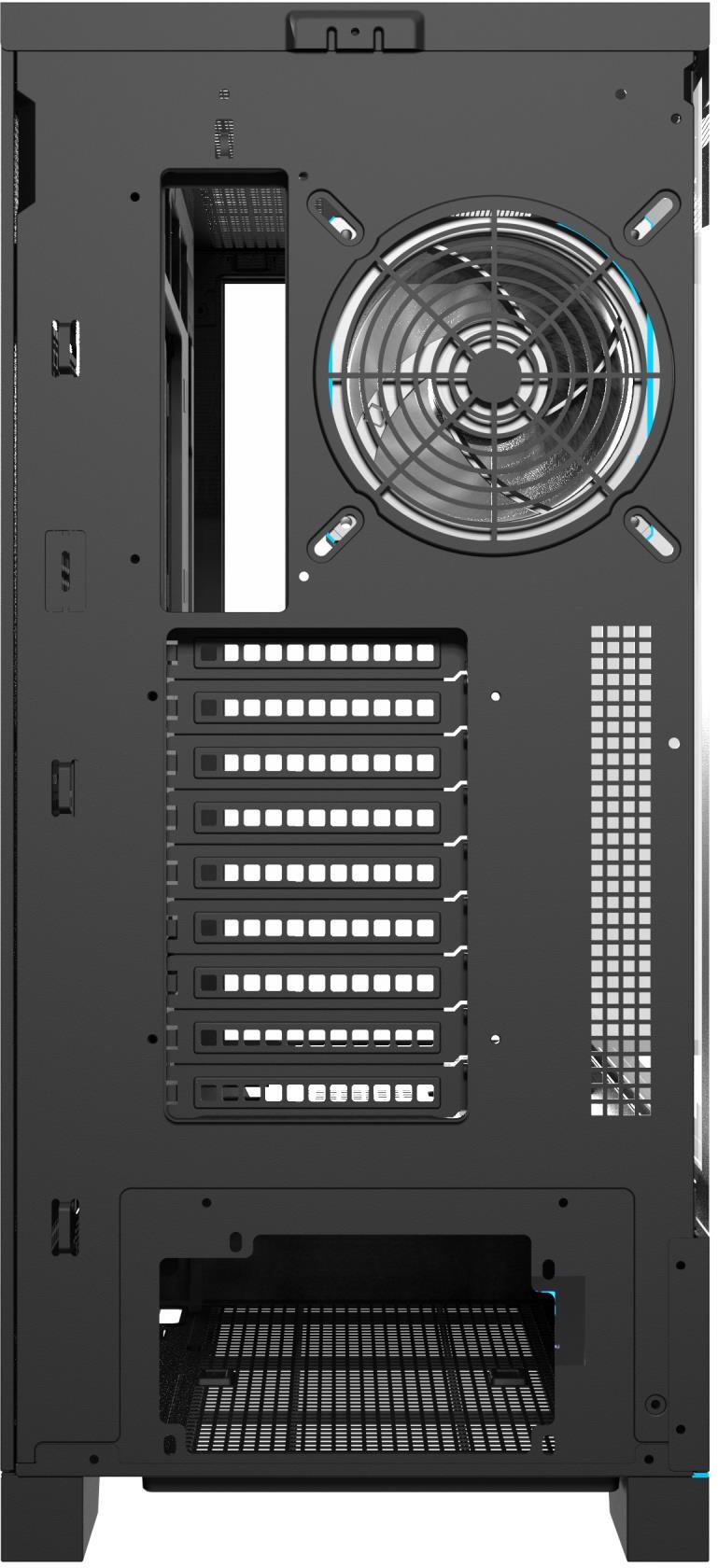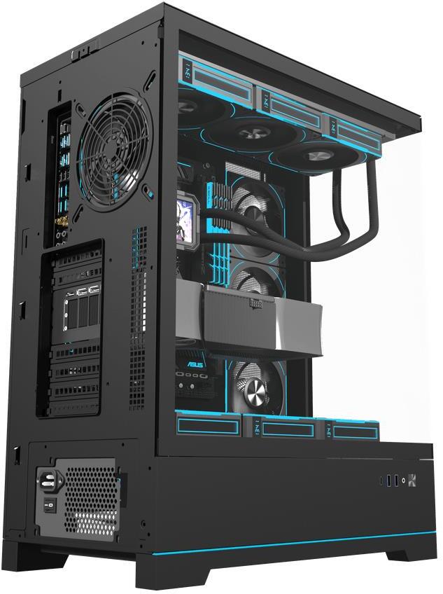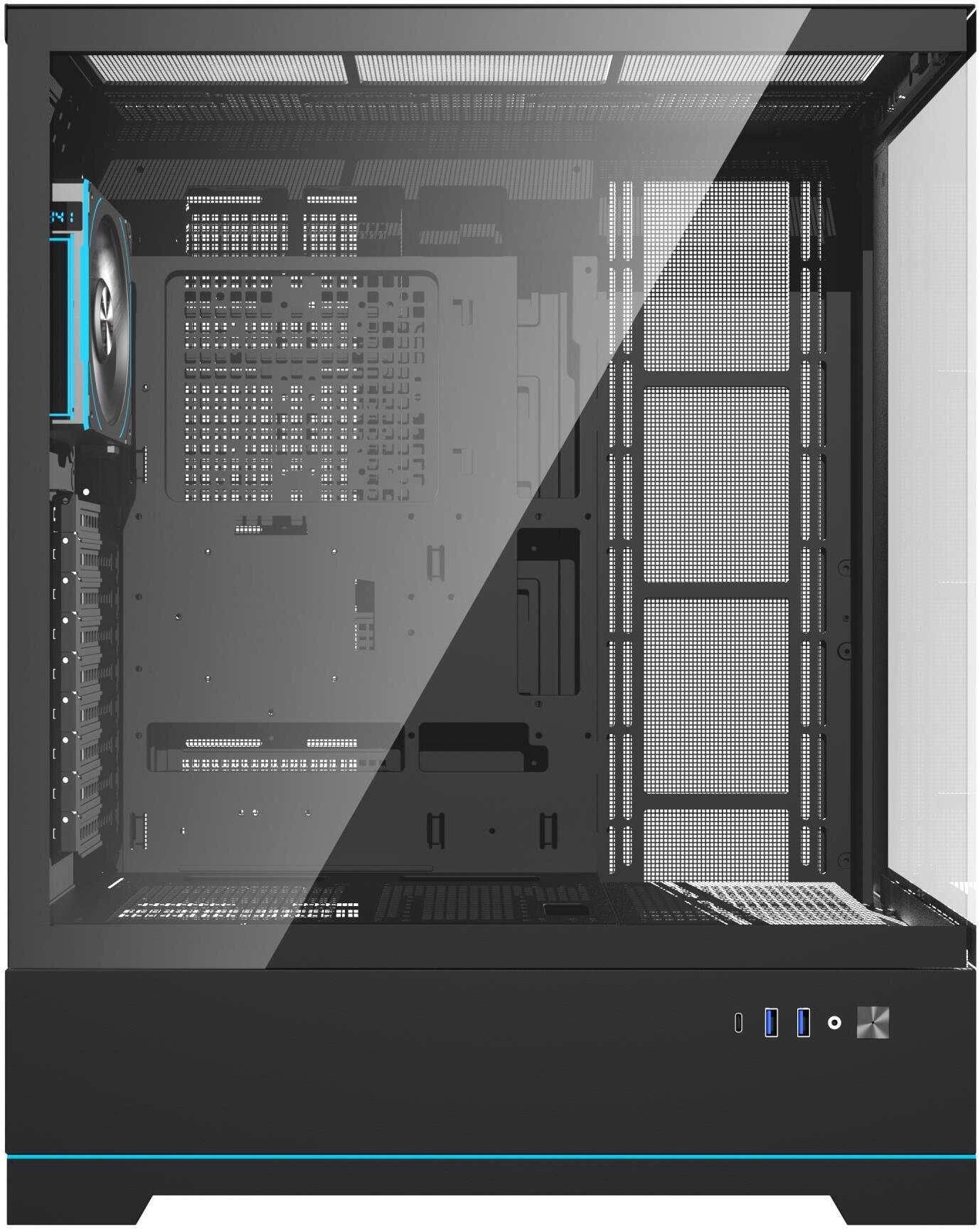 Серед ключових особливостей — розширена підтримка охолодження: чотирирівнева система з регулюванням швидкості вентиляторів, реальним часом відображення температури, можливістю встановлення до 11 вентиляторів розміром 120 мм та радіаторів до 480 мм (збоку). Корпус підтримує материнські плати форматів ATX, M-ATX та ITX, відеокарти довжиною до 420 мм та процесорні кулери висотою до 180 мм.
