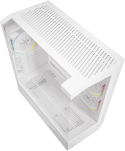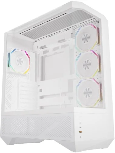Корпус DARKFLASH DY460 є компактним ATX-рішенням з вертикальною двокамерною конструкцією, що забезпечує ефективне використання простору. Він паралельний моделі DY470, але економить до 23% місця на столі завдяки оптимізованій компоновці. Трикамерний дизайн з трьома сторонами загартованого скла створює майже 330-градусний панорамний огляд внутрішніх компонентів, роблячи збірку візуально привабливою та сучасною.