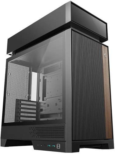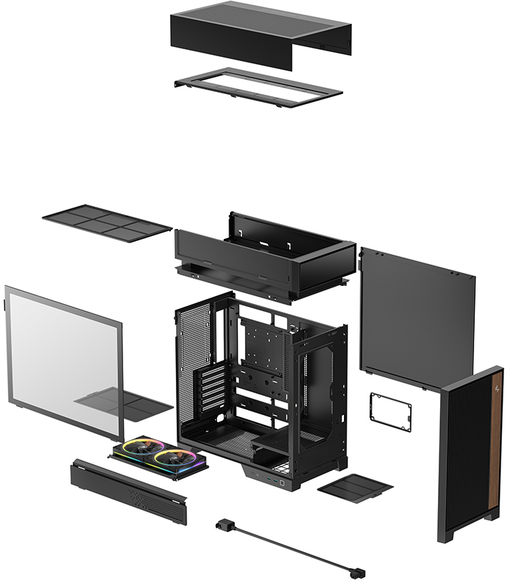 Корпус виконаний у чорному кольорі з поєднанням матеріалів ABS, SPCC-сталі та загартованого скла.Бокова панель прозора, що дозволяє повністю насолоджуватись виглядом компонентів та підсвіткою. Передня панель із вертикальними решітками забезпечує природне надходження повітря і задає стриманий геометричний ритм у дизайні. Декоративна вставка з текстурою натурального дерева на корпусі органічно поєднує теплий матеріальний акцент із сучасним технічним виглядом. Всі панелі знімаються без інструментів, а простір для укладання кабелів становить 35 мм. У конструкцію також вбудовано висувний гачок для навушників та кронштейн для підтримки відеокарти.