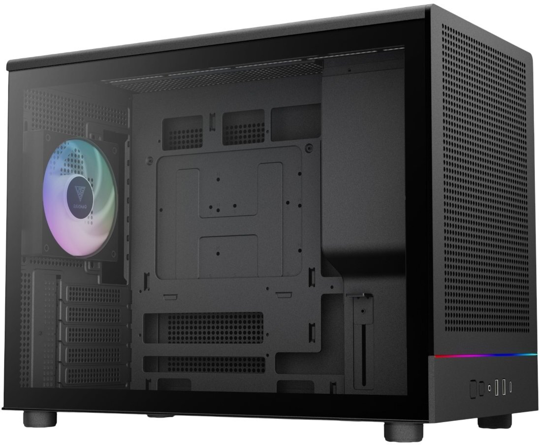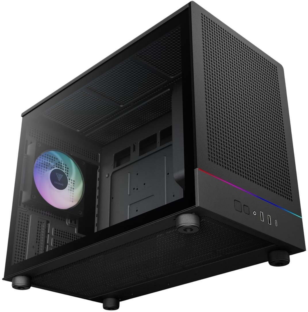 Інтер'єр корпусу вражає продуманістю: попри компактні габарити, він забезпечує достатньо місця для сучасних компонентів, таких як материнські плати формату Micro-ATX чи Mini-ITX, відеокарти довжиною до 395 мм і ефективні системи охолодження. Зручний доступ до внутрішніх елементів спрощує монтаж і подальше обслуговування, роблячи процес складання приємним навіть для початківців. Матеріали високої якості, включаючи міцний сталевий каркас і панелі з загартованого скла, гарантують довговічність і стійкість до навантажень.