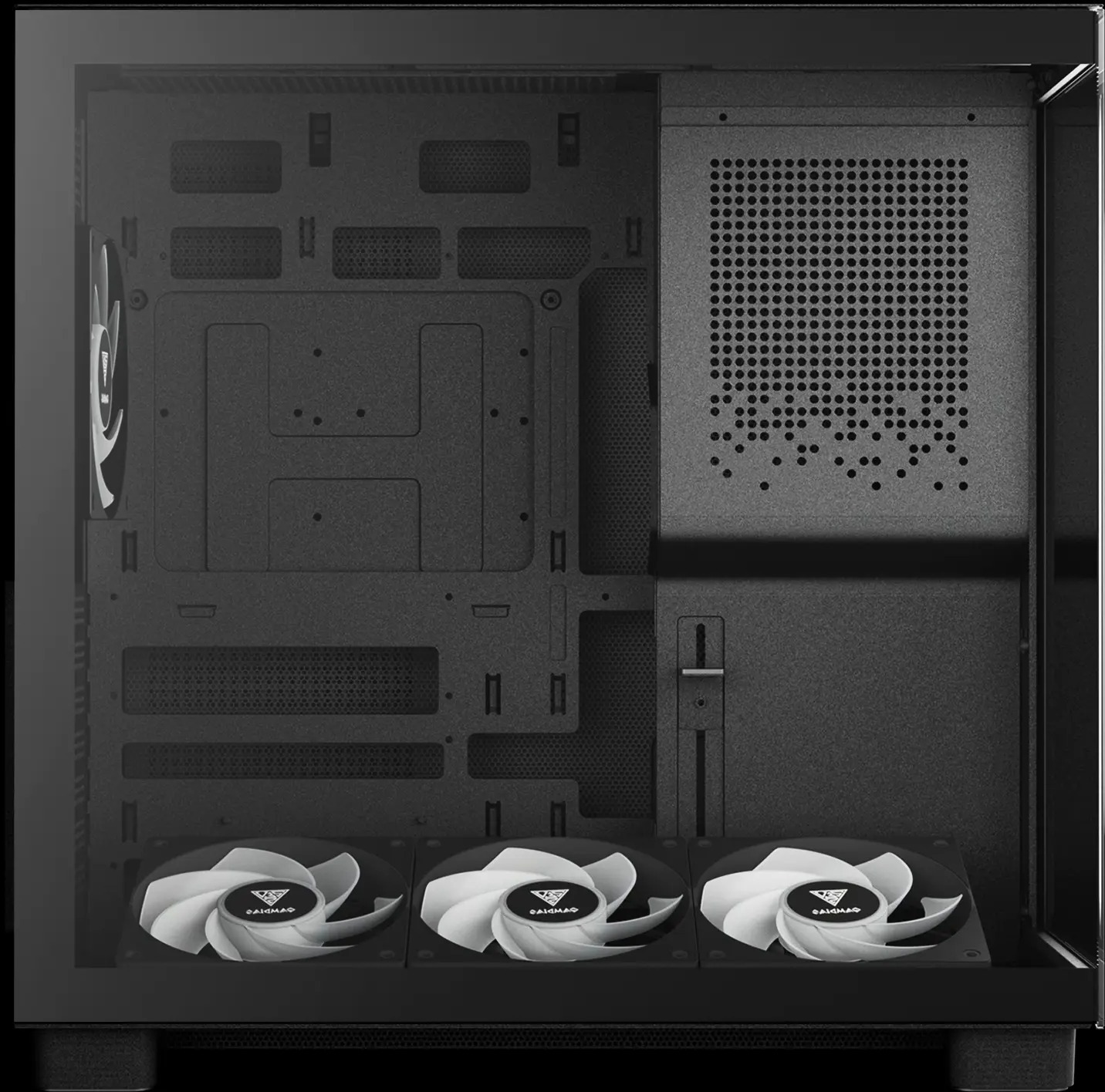 Корпус GAMDIAS ATLAS M4 — це сучасний mid-tower, який поєднує вражаючу візуальну привабливість із потужним охолодженням. Його головна особливість — безшовне панорамне скло, що охоплює передню та бокову частини, дозволяючи повністю насолоджуватися видом на компоненти збірки зверху донизу. Завдяки такому дизайну та перенесенню блоку живлення у фронтальну зону, внутрішній простір виглядає чистим і акуратним, без традиційного нижнього кожуха для БЖ. Корпус ідеально підходить для материнських плат із прихованими конекторами, що допомагає створити збірку практично без видимих кабелів.