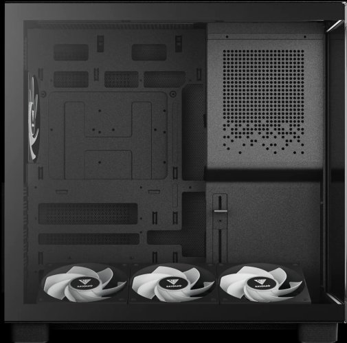 Особливу увагу привертає система охолодження, побудована за принципом природної димохідної вентиляції. Свіже повітря надходить через перфороване дно, де встановлено регульовані вентилятори під кутом, спрямовані безпосередньо на відеокарту для максимальної ефективності охолодження GPU. У комплекті йде чотири 120-мм вентилятори NOTUS M1 PWM ARGB, які забезпечують яскраве підсвічування та динамічний повітряний потік. Така конструкція дозволяє ефективно відводити гаряче повітря вгору, створюючи оптимальні температурні умови навіть під високим навантаженням.