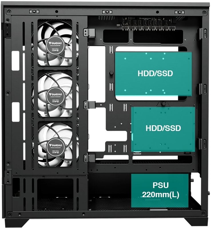 Однією з ключових особливостей ATLAS P1 є чотири вбудовані 120-мм вентилятори з підтримкою ARGB-підсвічування та PWM-керування. Вони забезпечують ефективне охолодження компонентів і дозволяють налаштовувати швидкість обертання для балансу між тишею та продуктивністю. Корпус також підтримує встановлення радіаторів рідинного охолодження до 420 мм зверху та збоку, що робить його придатним для потужних систем. Просторий внутрішній простір дозволяє розмістити відеокарти довжиною до 455 мм як у горизонтальній, так і у вертикальній орієнтації, а також сумісний із материнськими платами з прихованими конекторами для чистішого кабельного менеджменту.