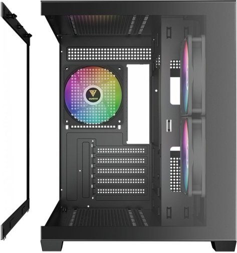 Виготовлений у формфакторі Micro-Tower, корпус сумісний із материнськими платами Micro-ATX і Mini-ITX, що робить його універсальним для компактних збірок. Конструкція поєднує міцну сталь SPCC, ABS-пластик і панорамну бічну панель із 4-мм загартованого скла, яка ефектно демонструє внутрішні компоненти. Чорний колір із глянцевими акцентами додає елегантності, а три попередньо встановлені 120-мм вентилятори з ARGB-підсвіткою (два спереду, один ззаду) створюють яскраве освітлення, синхронізоване через 5V 3-піновий роз’єм із материнськими платами. Сітчаста передня панель із магнітним пиловим фільтром забезпечує відмінний повітряний потік, підтримуючи низькі температури компонентів.