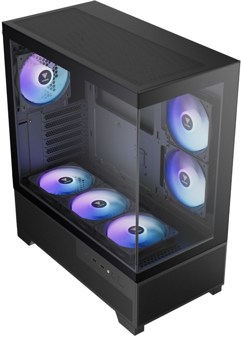 Конструкція Gamdias Aura GC12 ARGB акцентує на балансі між вентиляцією та дизайном: панорамна передня панель з загартованого скла поєднується з перфорованою сіткою для посиленого потоку повітря, оснащена шістьма попередньо встановленими 120-мм ARGB-вентиляторами — по два на боці, три внизу та один ззаду, — що не тільки забезпечують ефективне охолодження процесора, графічного процесора та накопичувачів, але й створюють яскраву, кастомізовану RGB-атмосферу для ігрового настрою, з підтримкою 5V 3-Pin ARGB-синхронізації для інтеграції з материнськими платами.