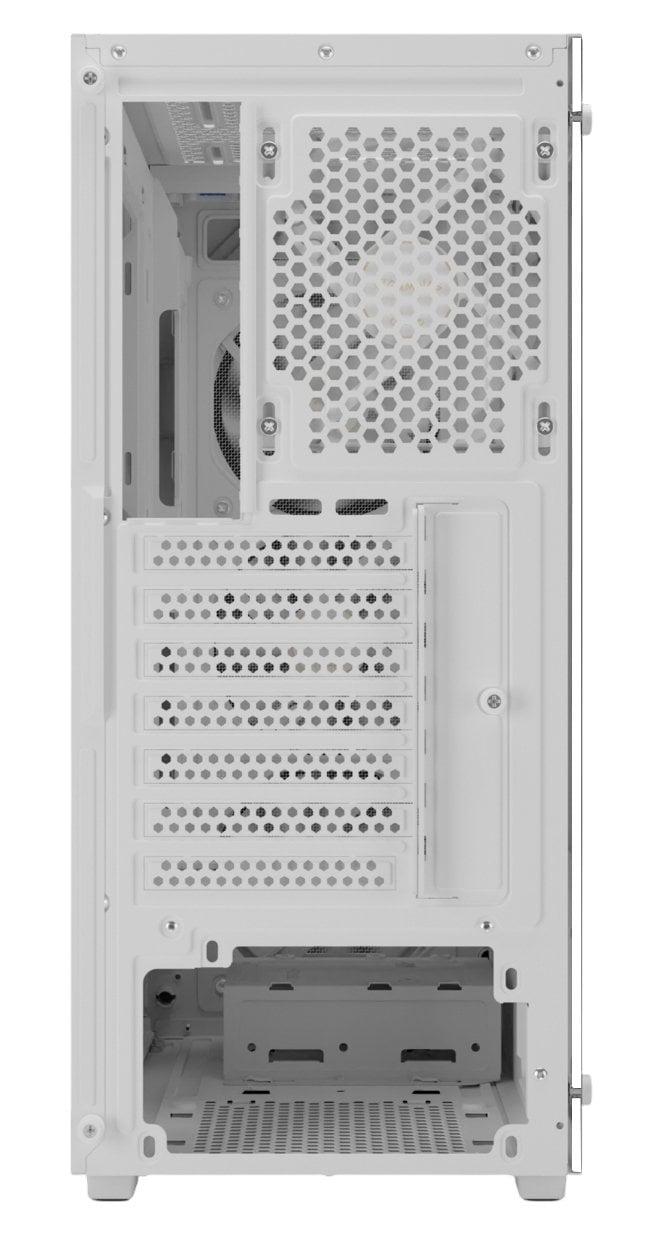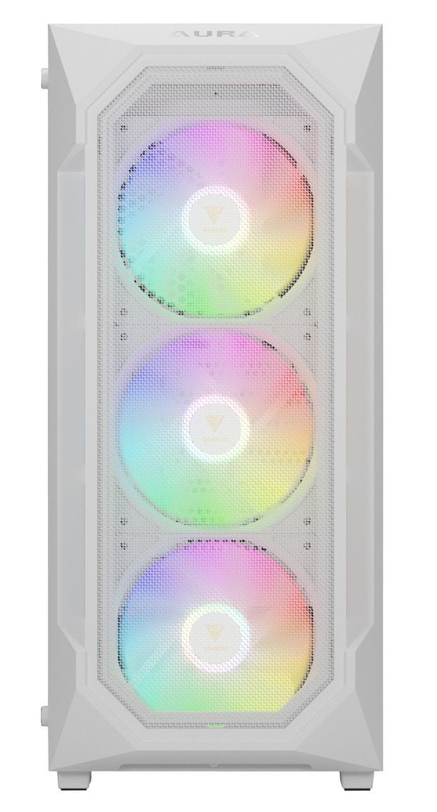 Корпус виконаний у формфакторі Mid-Tower і сумісний із материнськими платами ATX, Micro-ATX і Mini-ITX. Його конструкція виготовлена з міцної сталі SPCC, ABS-пластику та загартованого скла, що забезпечує довговічність і привабливий вигляд. Білий колір із глянцевими акцентами та панорамна бічна панель із 4-мм загартованого скла дозволяють ефектно продемонструвати внутрішні компоненти, підкреслені чотирма попередньо встановленими 120-мм вентиляторами з ARGB-підсвіткою (три спереду, один ззаду). Сітчаста передня панель із магнітним пиловим фільтром гарантує оптимальний повітряний потік, сприяючи ефективному охолодженню.