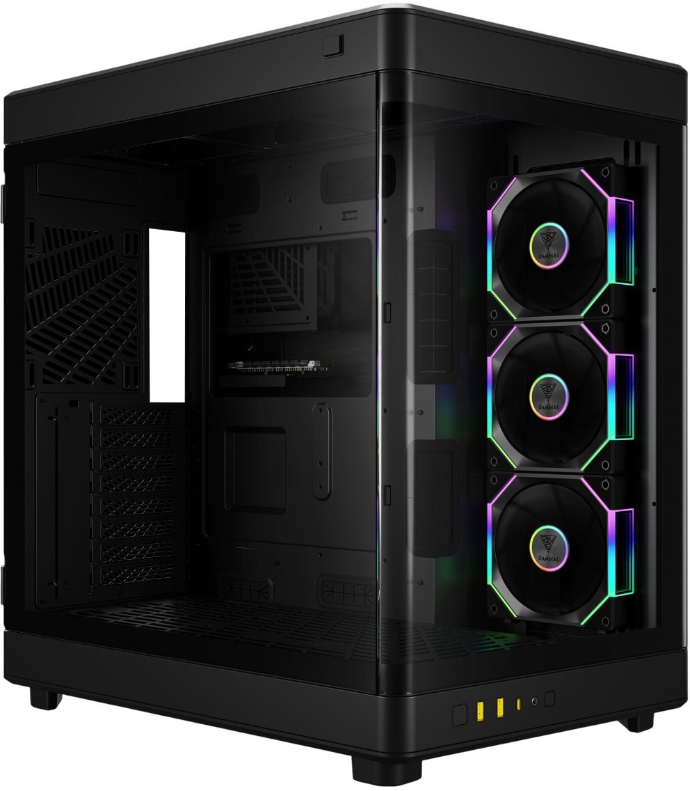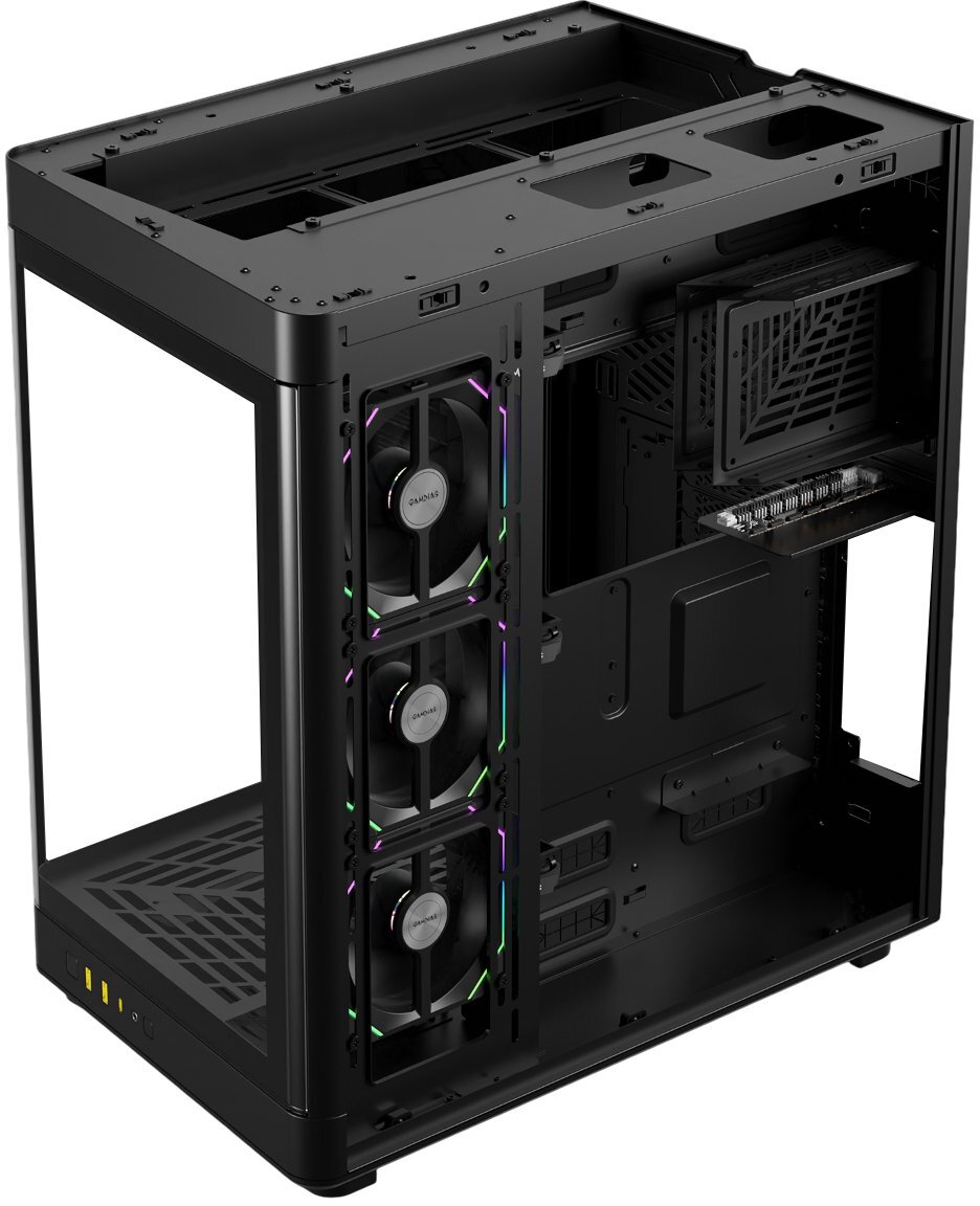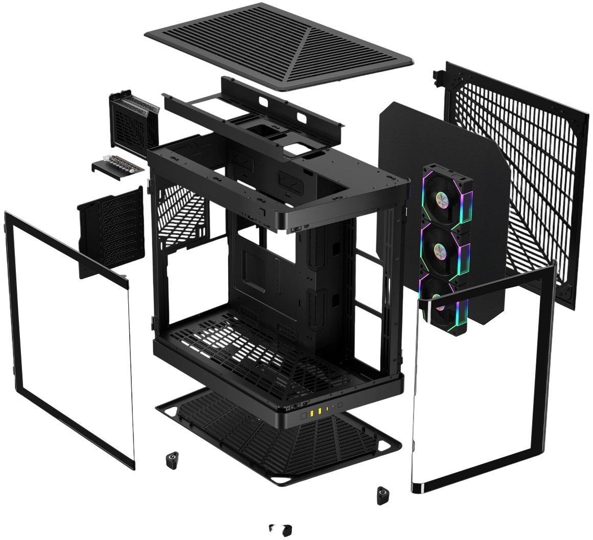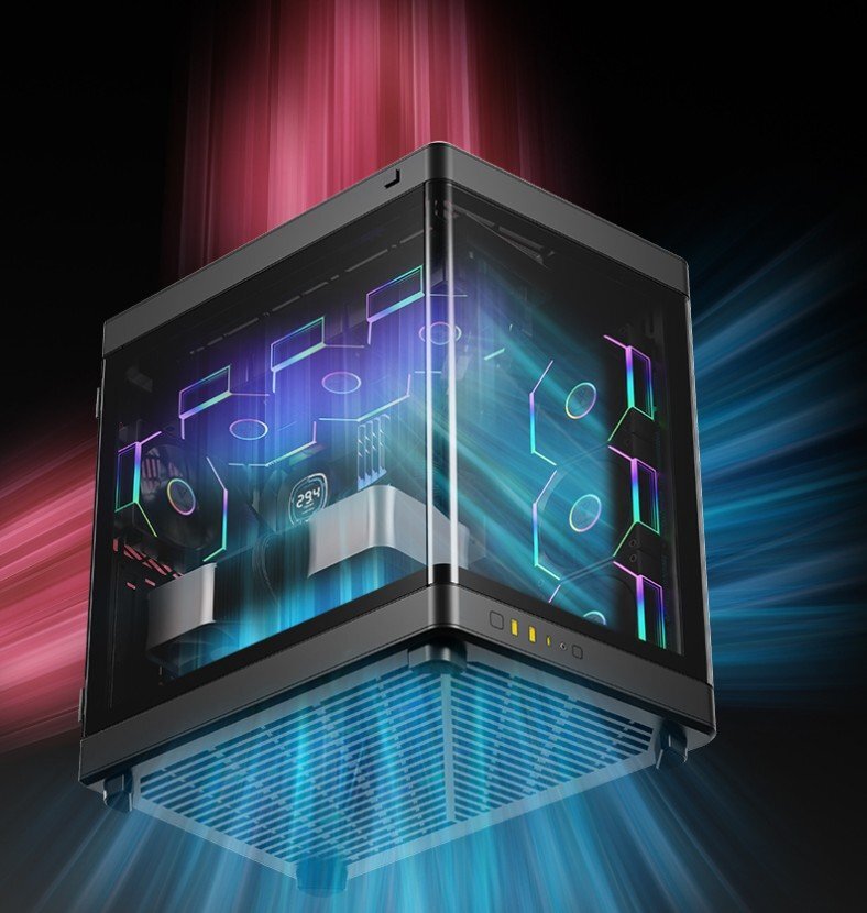 Модель оснащена безшовним панорамним дисплеєм із відкритою двокамерною конструкцією, який демонструє всі компоненти системи, приховуючи непривабливі кабелі. Для зручності обслуговування передні та бічні панелі з загартованого скла легко відкидаються за допомогою механізму одним дотиком, а магнітна модульна орієнтація дозволяє швидко змінювати положення корпусу.