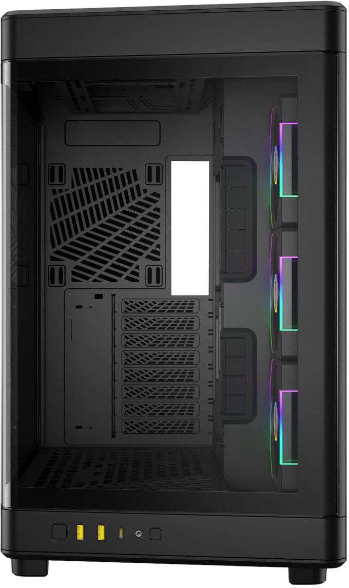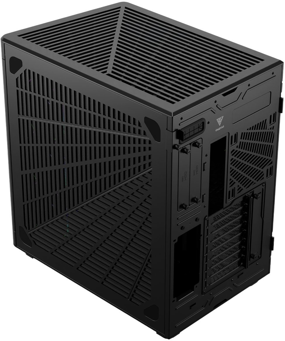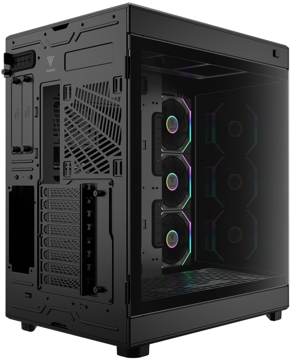 Модель оснащена безшовним панорамним дисплеєм із відкритою двокамерною конструкцією, який демонструє всі компоненти системи, приховуючи непривабливі кабелі. Для зручності обслуговування передні та бічні панелі з загартованого скла легко відкидаються за допомогою механізму одним дотиком, а магнітна модульна орієнтація дозволяє швидко змінювати положення корпусу.