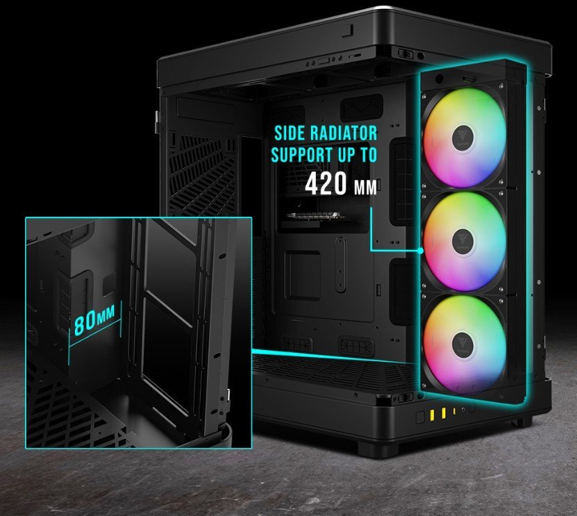 Корпус пропонує масивний інтер’єр із двокамерним розташуванням, покращене управління кабелями, приховані канали для проводки та липучки для акуратної організації. Можна встановити до 10 вентиляторів, а верхній кронштейн дозволяє легко монтувати радіатори довжиною до 280–360 мм.