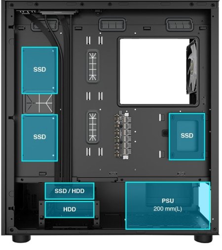 Щодо сумісності, TALOS M3 MESH підтримує материнські плати формату E-ATX, ATX, Micro-ATX і Mini-ITX, відеокарти довжиною до 390 мм і блоки живлення до 200 мм. Це забезпечує гнучкість під час складання потужних систем. Корпус має 7+3 слоти розширення, що дозволяє встановлювати додаткові карти. Для зручності кабельного менеджменту передбачено достатньо місця за задньою панеллю, а також спеціальний відсік для приховування надлишкових кабелів біля блока живлення.